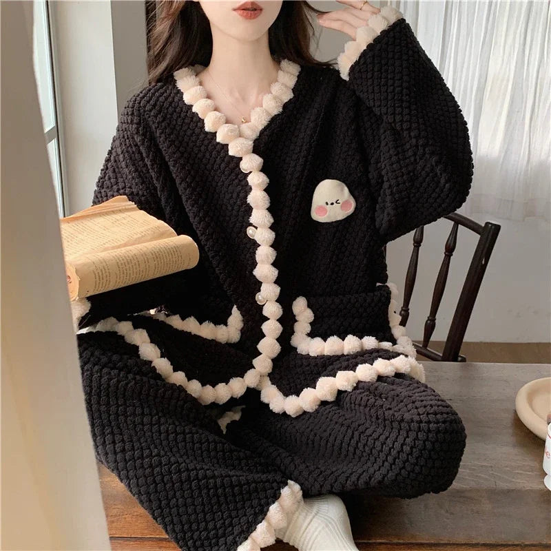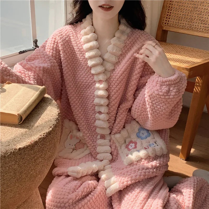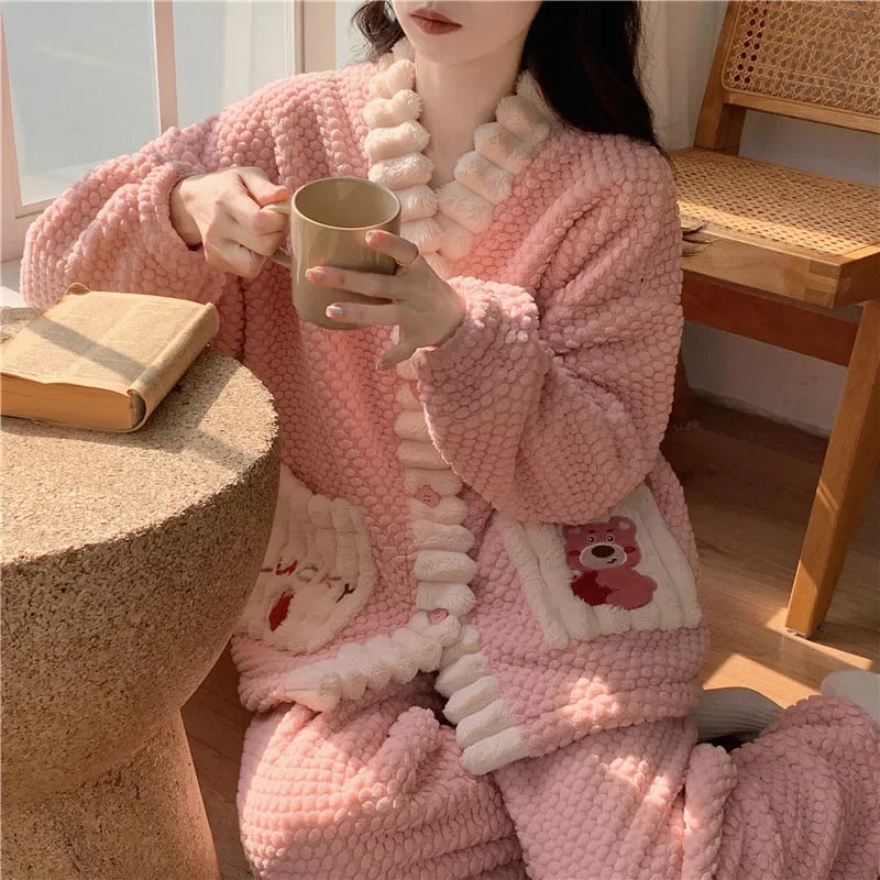 Kawaii Coral Velvet Girls Pajamas Sets Autumn Winter Warm V-neck Sleep Tops and Trousers Loungwear Suit Thick Homewear for Women