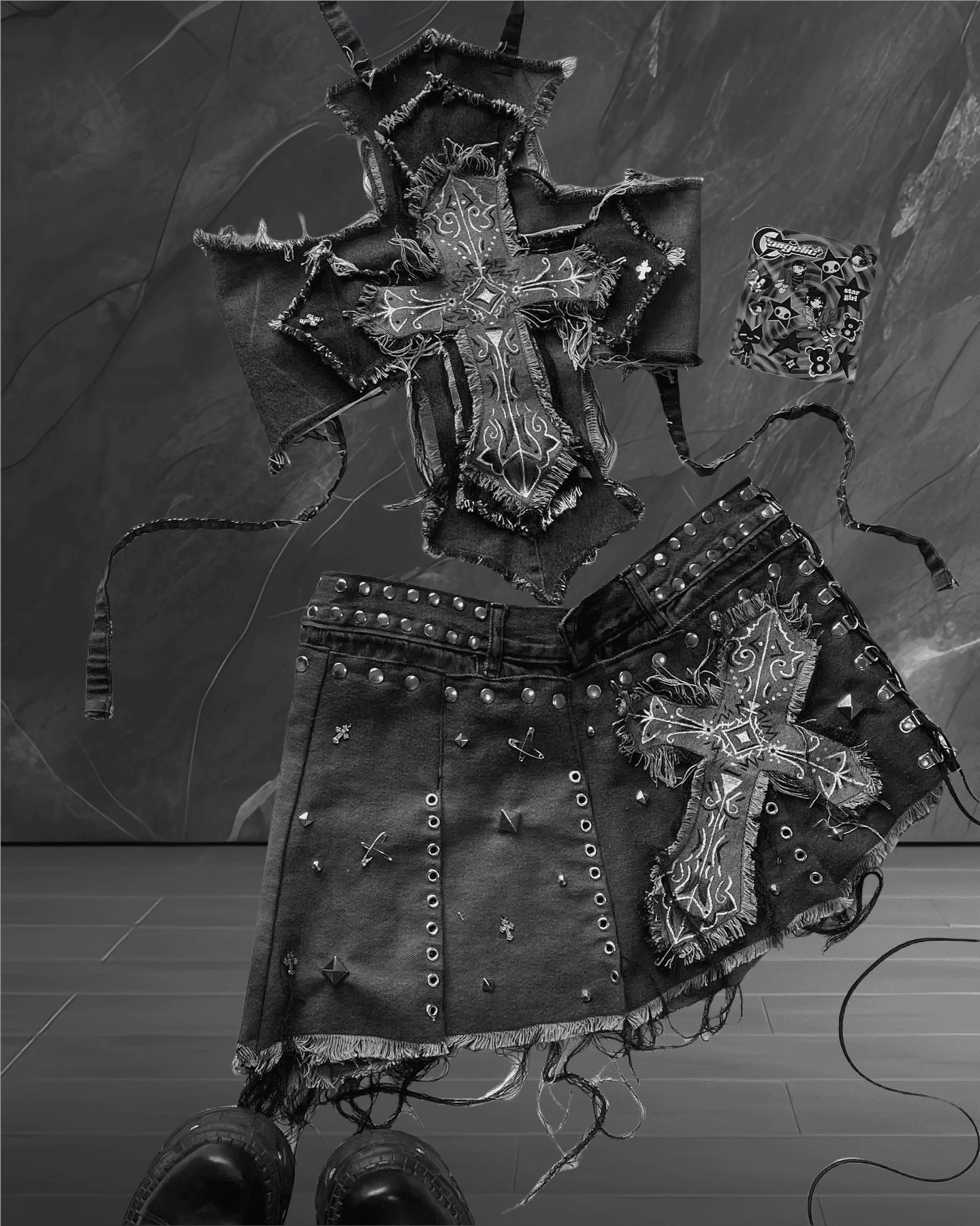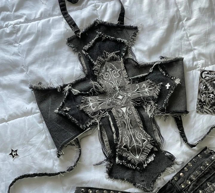 New Two Piece Sets Womens Outifits Retro Gothic Graphic Patch Y2K Clothing Denim Skirt Sets Suspender Slim Fashion Short Top