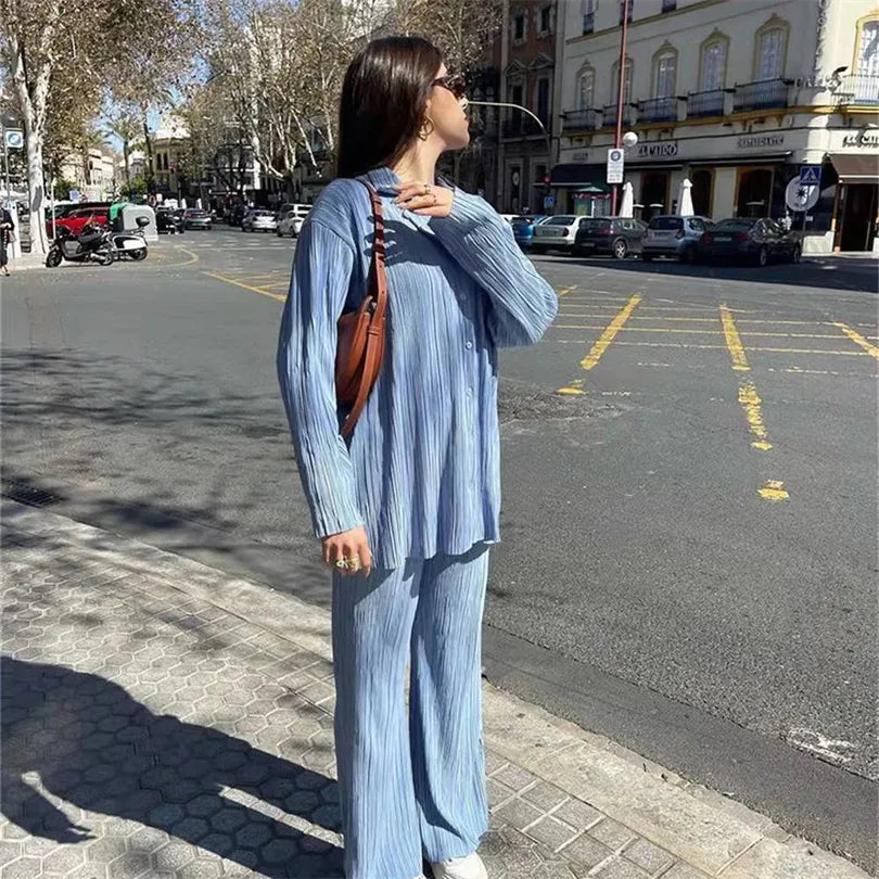 wsevypo Women Pleated 2 Piece Pants Sets Spring Summer Streetwear Long Sleeve Button Down Shirt+Straight-Leg Pants Loose Outfits