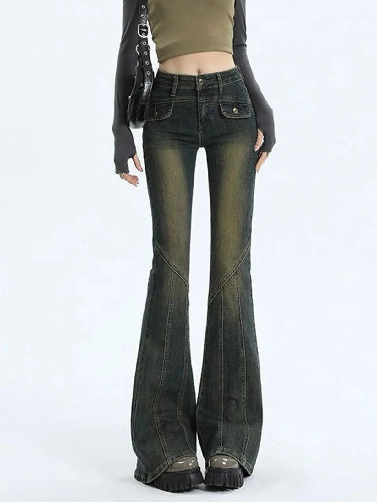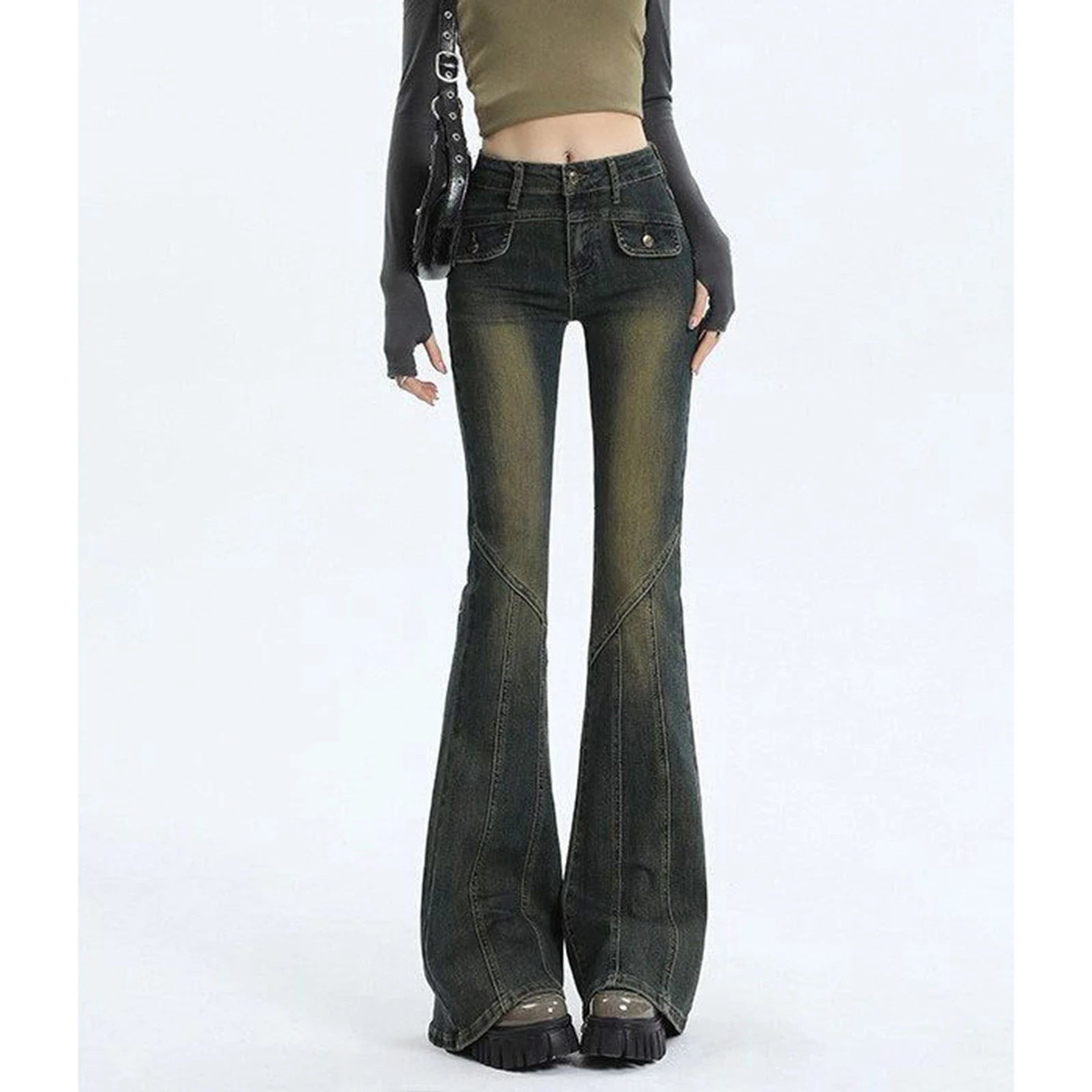 2024 Spring Autumn Women Splicing Micro Flared Jeans Vintage High Waisted Slim Fit Trousers Harajuku Street Trendy Denim Pants