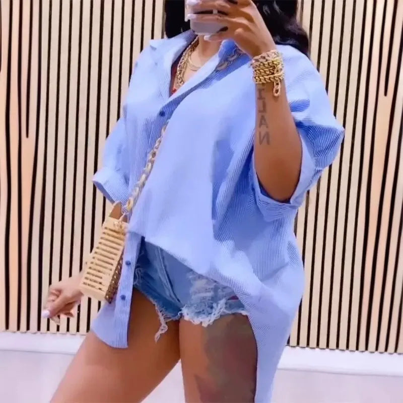 2024 Spring Summer New Women's Striped Back Hollow-out Split Drawstring Strap Design Half Sleeves Loose Shirt Top