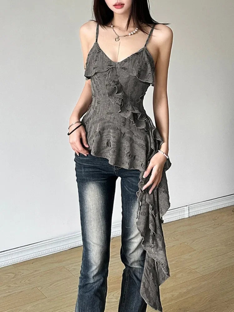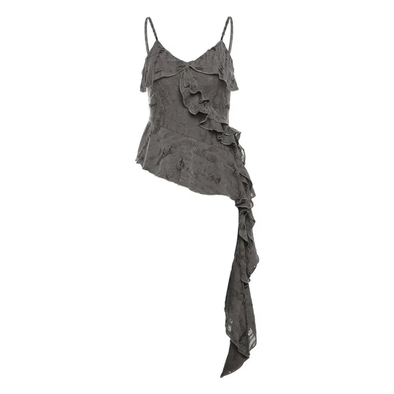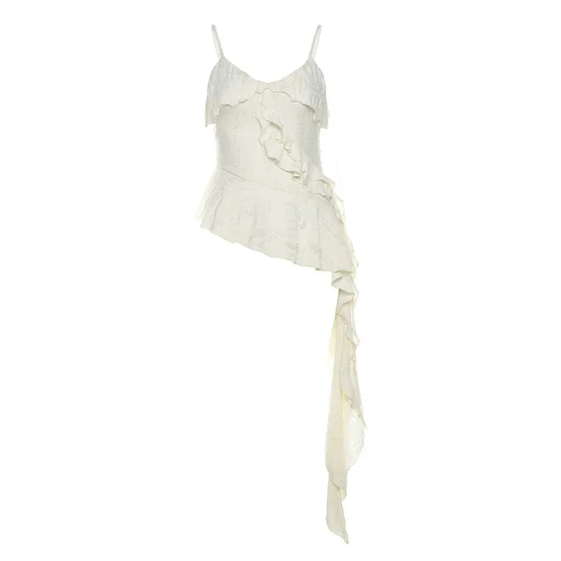 2024 Summer Irregular Ruffled Camisole Women Backless Y2k Vintage Solid Hole Tanks Female Grunge Sexy 2000s Aesthetic Long Tops