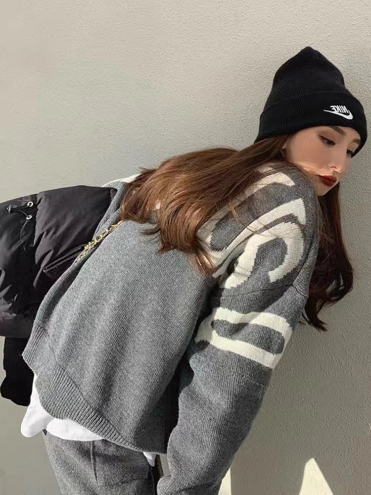 2Pcs Casual Knitted Wide Leg Pant Suit Women's Personality Letter Printing Versatile Loose Long Sleeved O-Neck Pullover Sweater