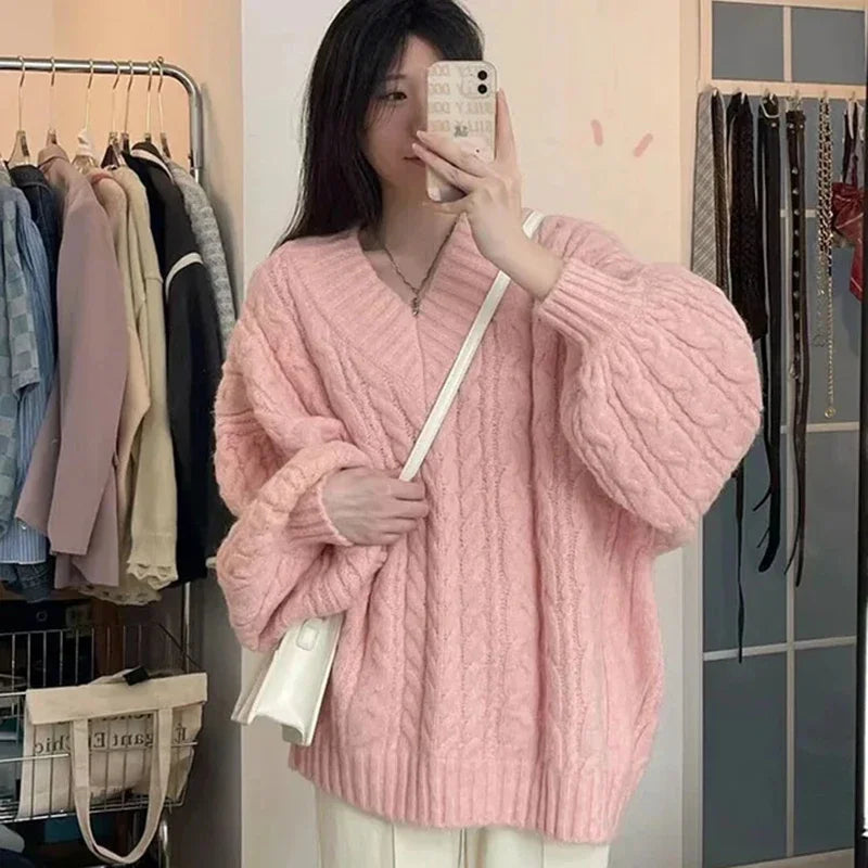 Autumn Winter Women Sweater Harajuku Oversized Knitted Pullovers Korean Long Sleeve V Neck Knitwear Preppy Solid Loose Jumper
