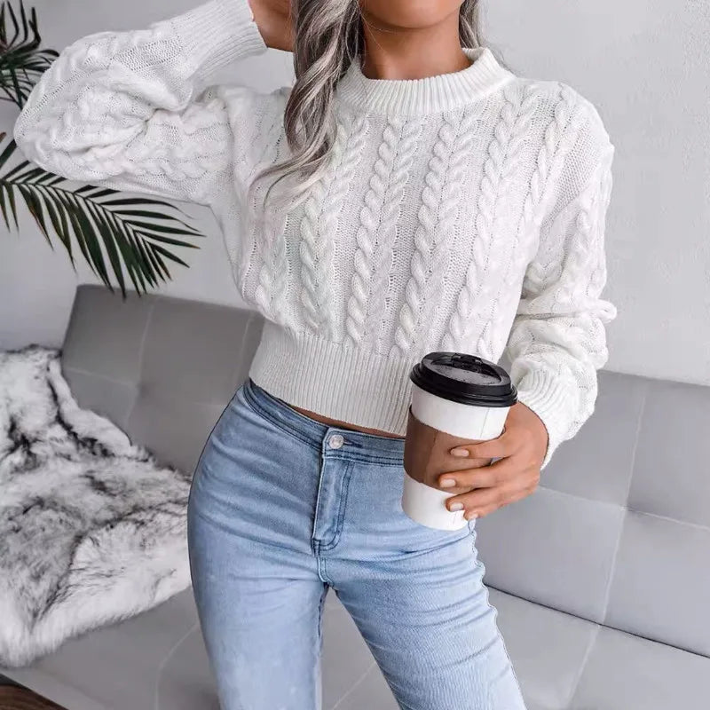 Crop Cable Knit White Sweater Long Sleeve Crew Neck Pullover Women Jumper Soft Girls Autumn Winter Thick & Warm Knitwear
