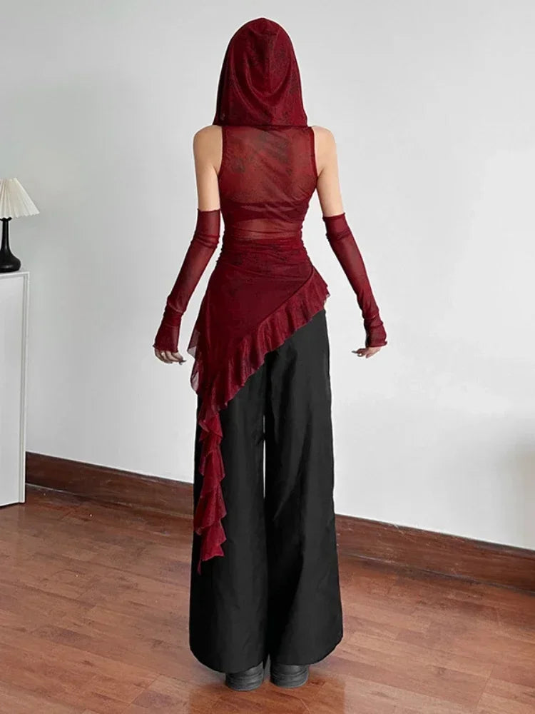 DERMEARNE 2025 New Retro Cyber Punk Streetwear Vest Women Dark Gothic Y2k Harajuku Sexy See Through Hooded Crop Tank Top Alt Grunge Outfit