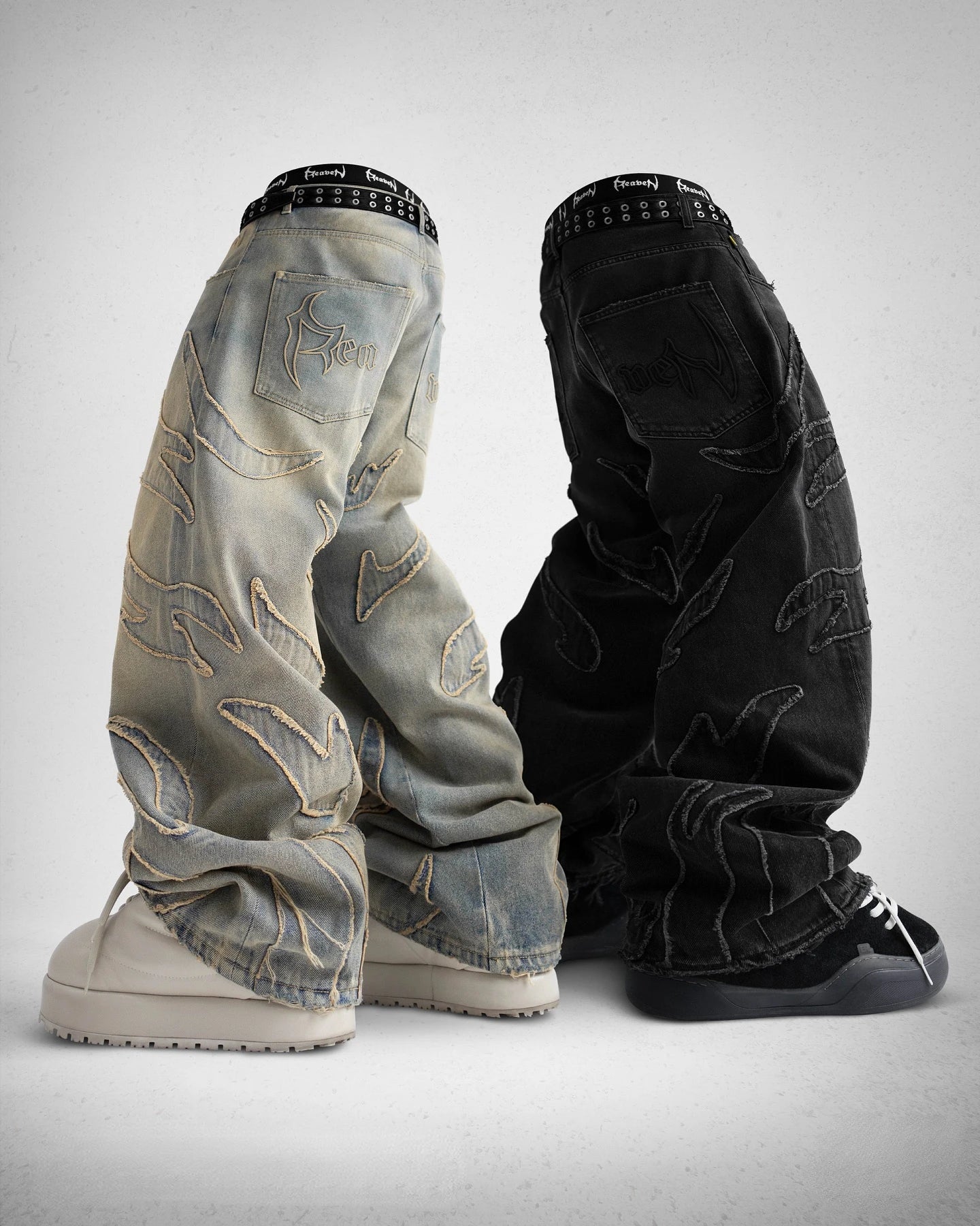 DERMEARNE 2025 Y2k Streetwear Retro Raw Edge Embroidery Baggy Jeans Men Women Fashion Hip Hop Personality Patchwork High Waist Denim Pants