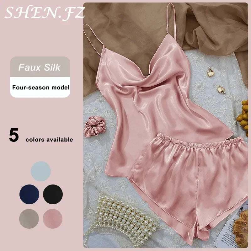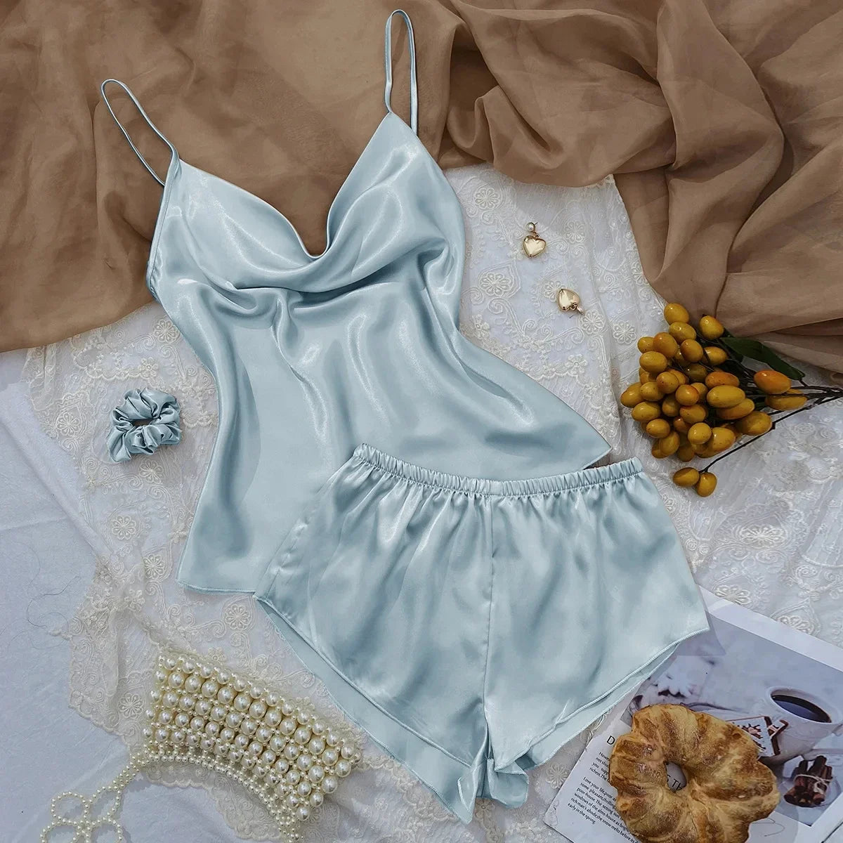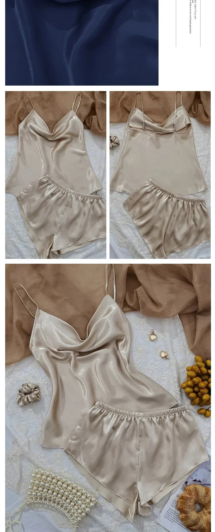 DERMEARNE 3 Pcs Set Women Pajama Sets Fashion Soild Suspenders and Shorts With Hanging Bag Home Wear Set Sexy Suspenders