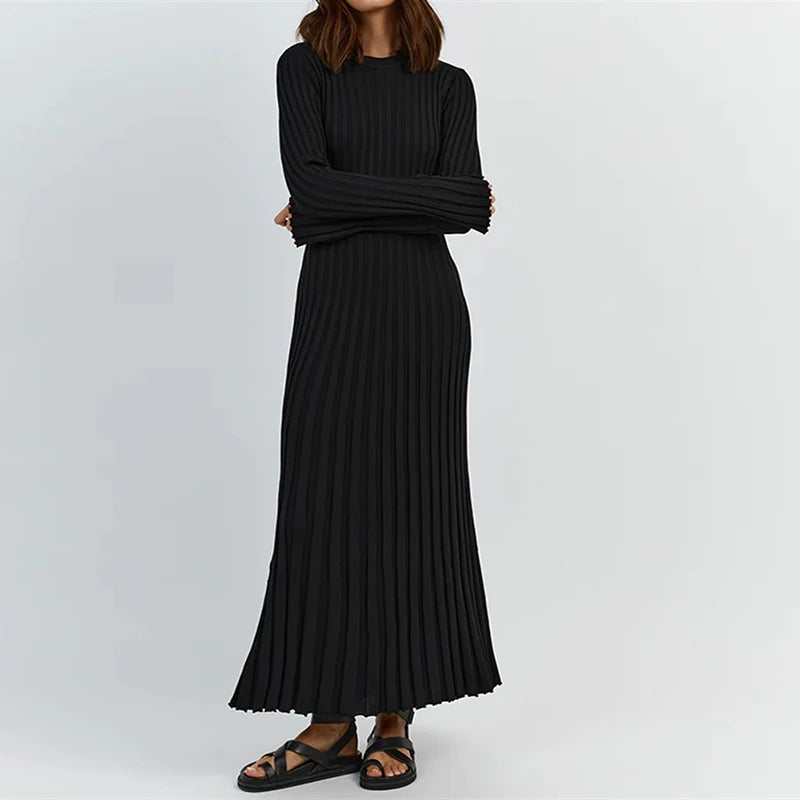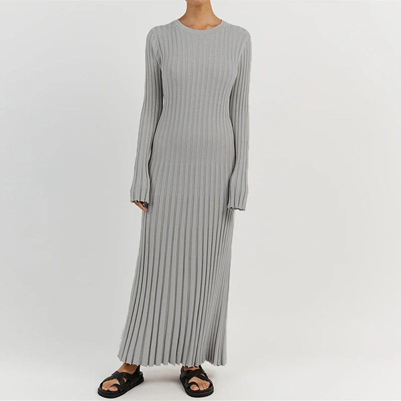 DERMEARNE 90s Vintage Tie Waist Dress Women Elegant Ribbed Knit Full Sleeve Maxi Dress Crew Neck Bodycon Pencil Long Dress Streetwear