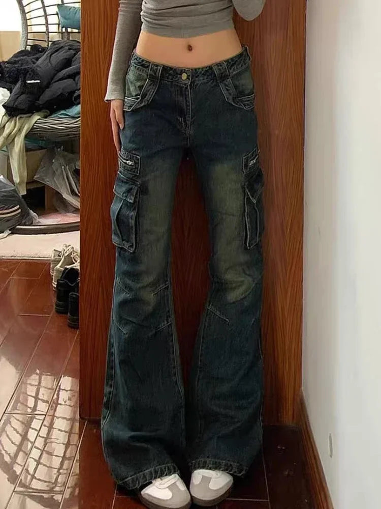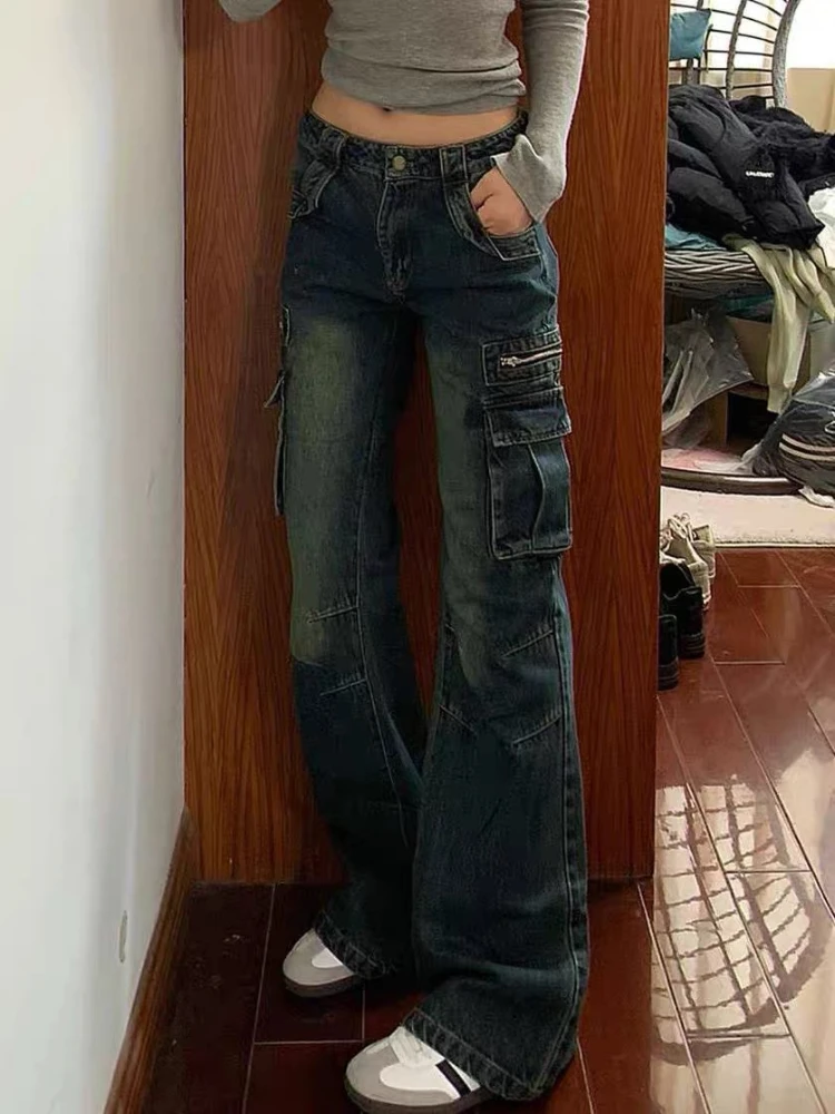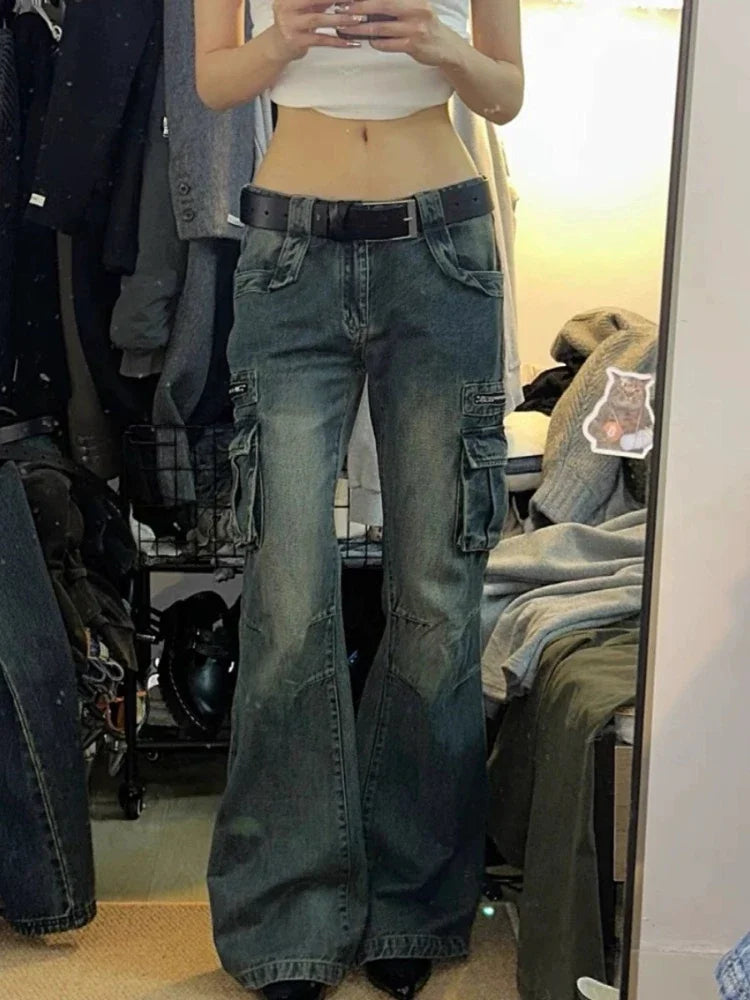 DERMEARNE ADAgirl Flared Baggy Jeans Women Y2k Retro Wide Leg Zipper Pockets Do Old Denim Pants Hip Hop Casual Korean Style Mujer Trousers
