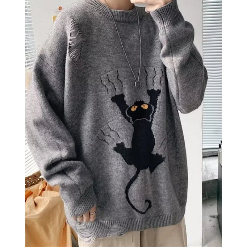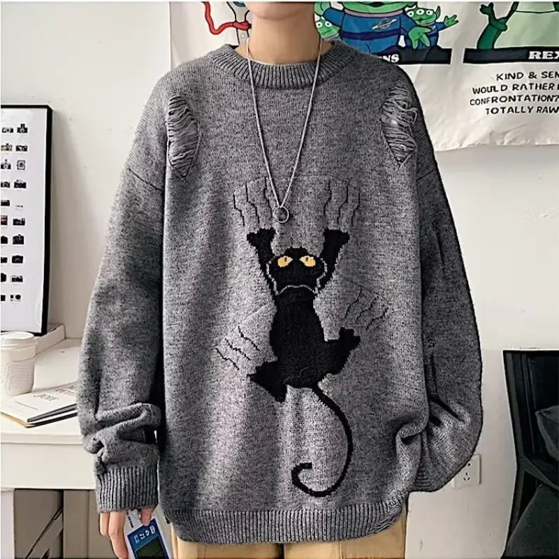 DERMEARNE American Retro Cartoon Cat Design Hole Sweaters Oversized Pullovers Men Unisex Fashion Winter Knitted Jumper Tops Kawaii Clothes