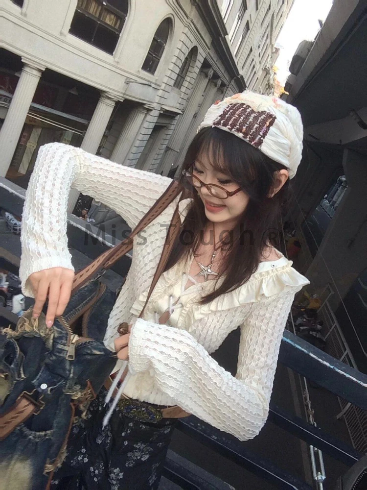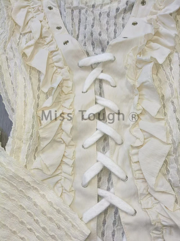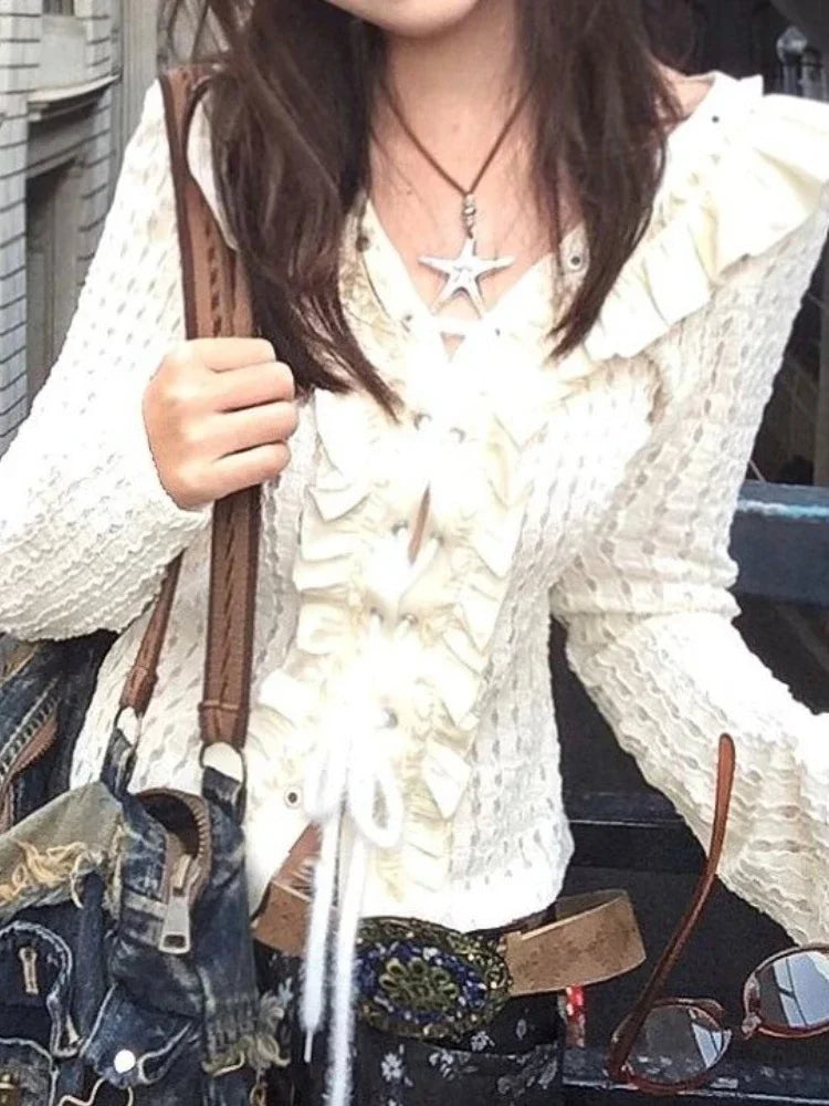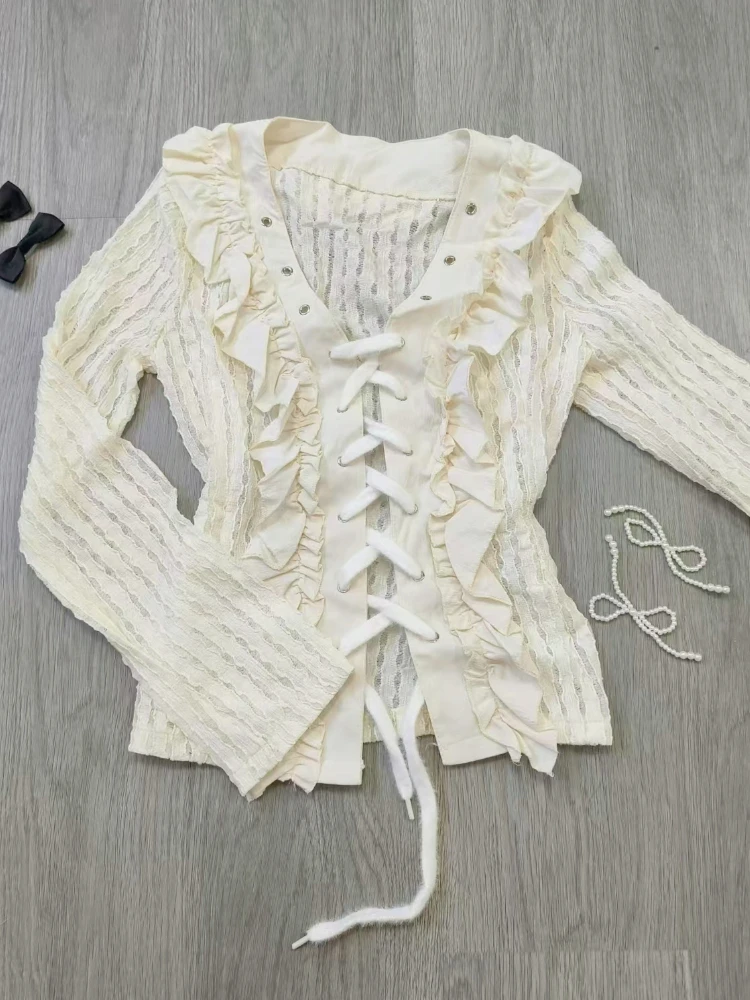 DERMEARNE Autumn Aesthetic Vintage Slim Knit Cardigan Women High Street Chic Long Sleeve Solid Ruffle Tops Female Goth Y2k Lace Up Top New