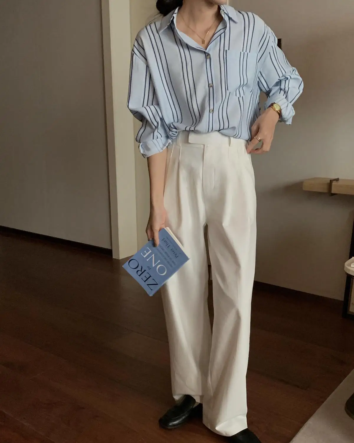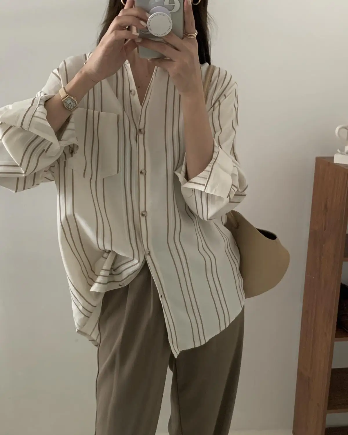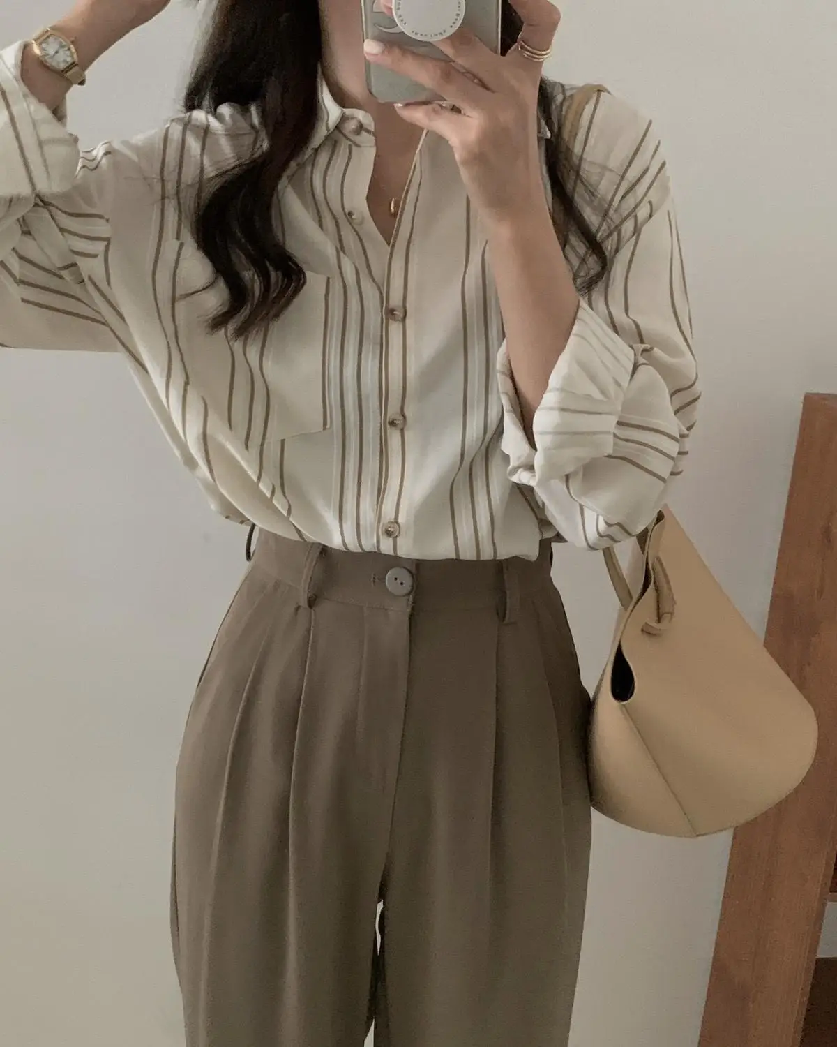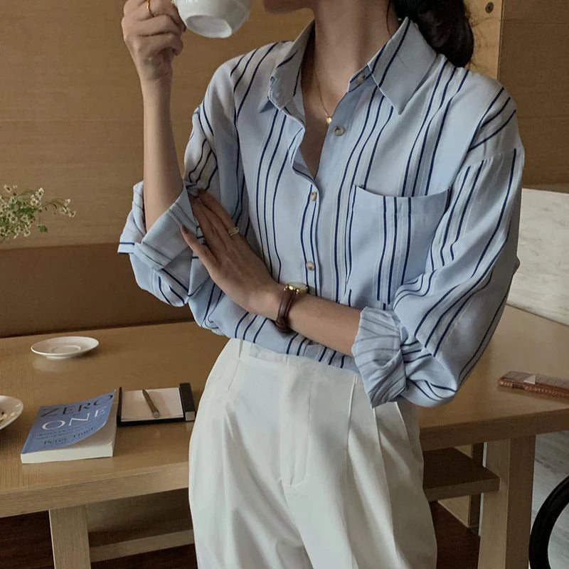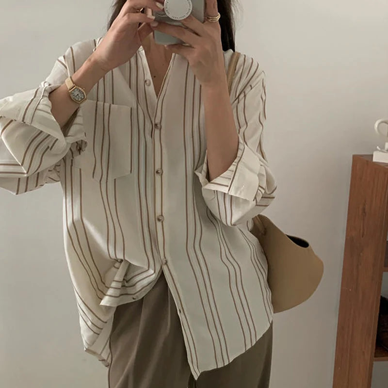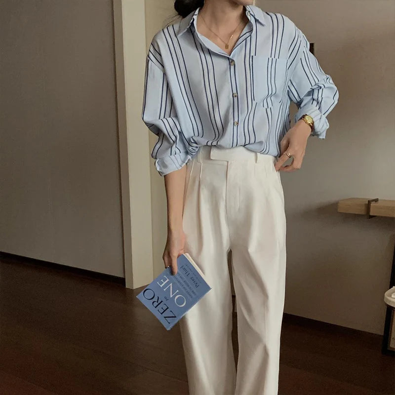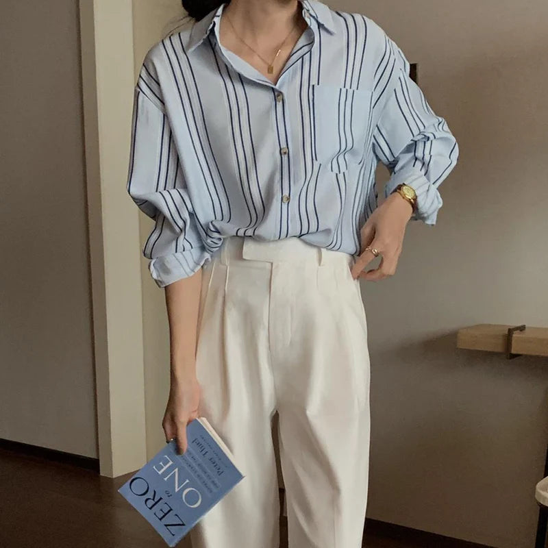 DERMEARNE Autumn New Loose Casual Versatile Striped Long Sleeved Shirt Korean Style Fashion Elegant Youthful Wind Polo-Neck Women's Top