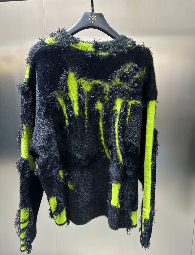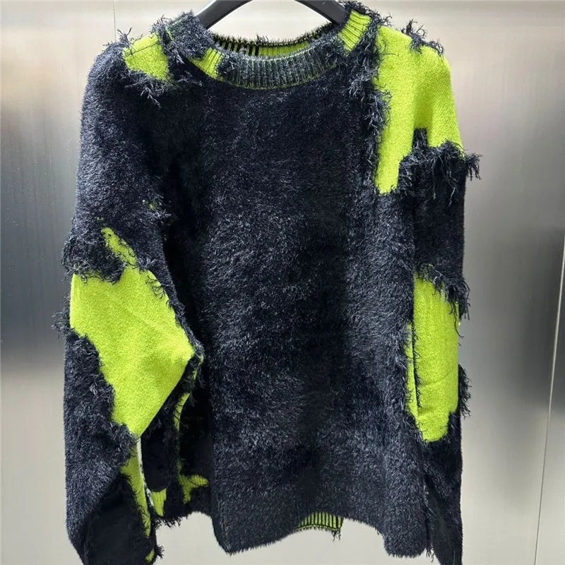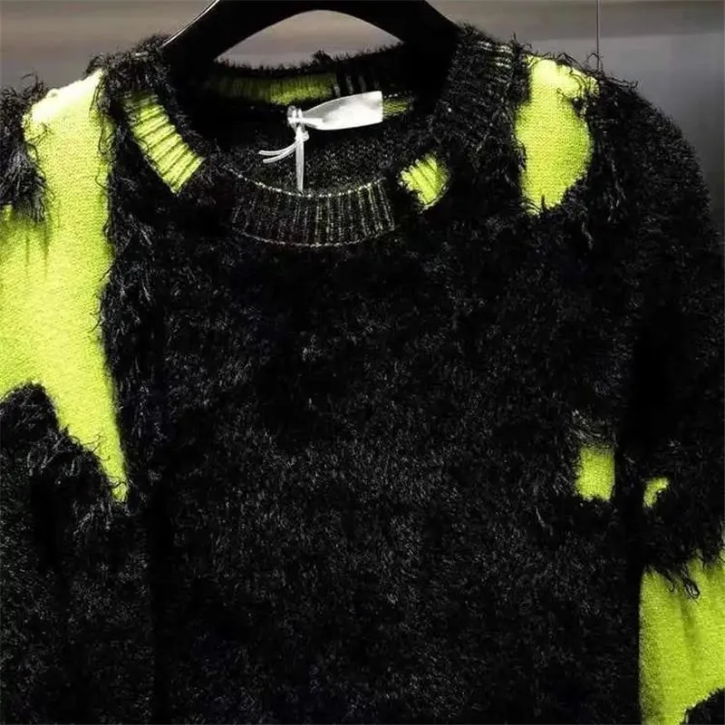 DERMEARNE Autumn Winter Contrast Color Patchwork Knit Pullover Women Stylish O-Neck Tassel Wool Sweater Mink Mohair Knitwear Runway 005K