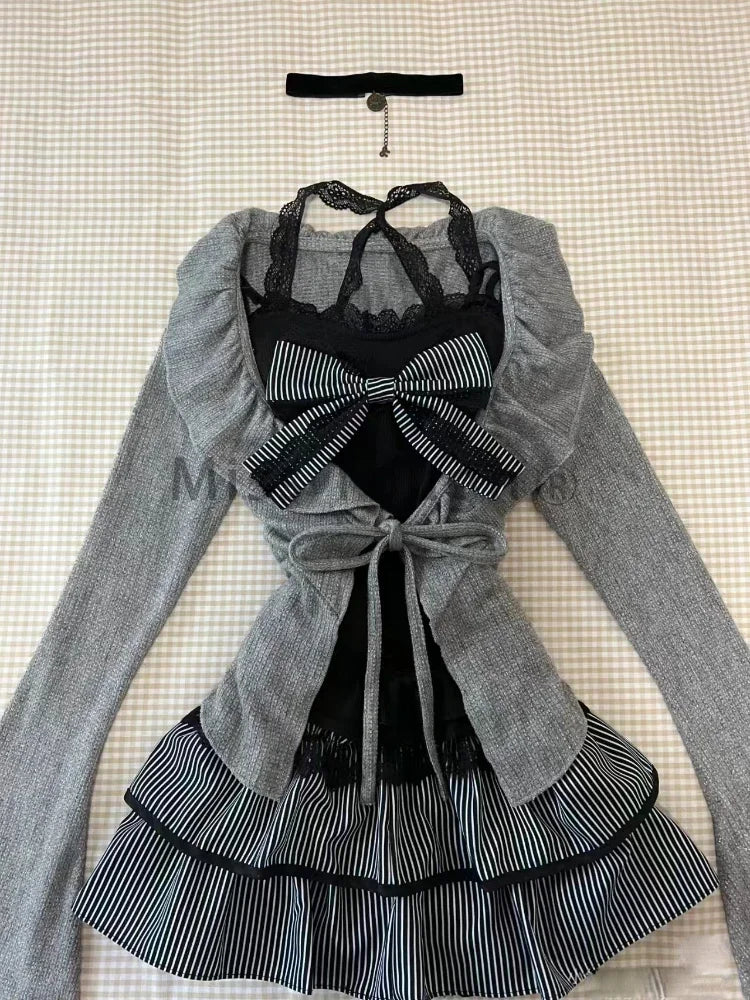 DERMEARNE Autumn Winter Lace Bow 3-piece Set Women Aesthetic Vintage Slim Long Sleeve Cardigan + Elastic Waist Ruffle Short Skirt Suit New