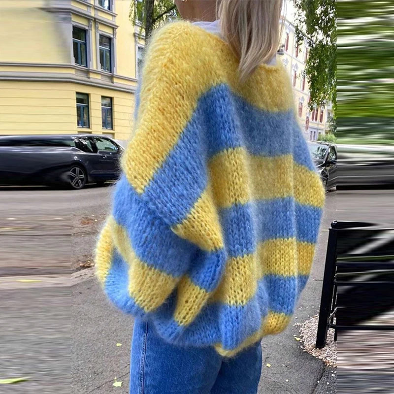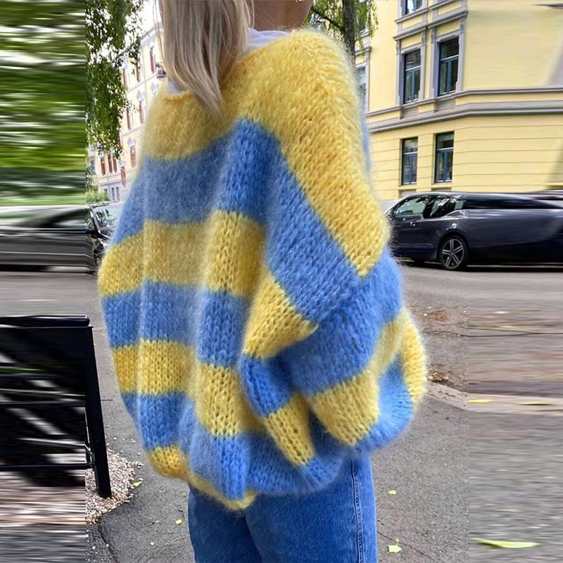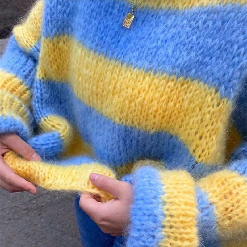 DERMEARNE Autumn Winter New O Collar Knitted Pullover Fashion Stripe Contrast Printed Sweater Casual Lantern Sleeve Loose Jumper For Women