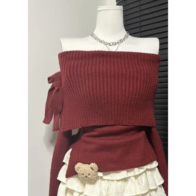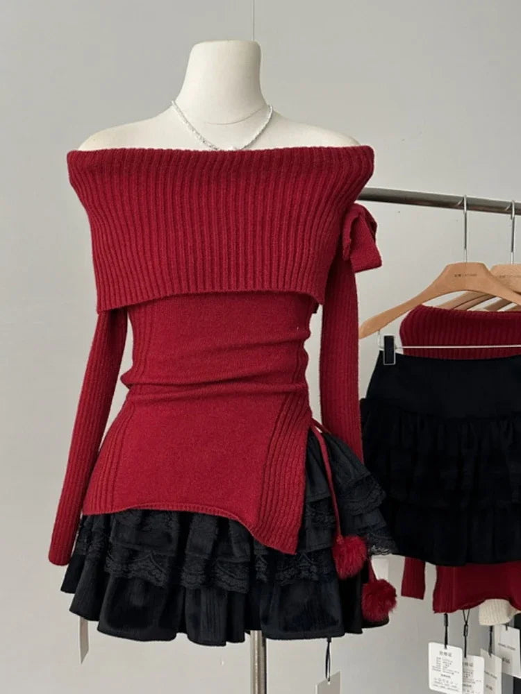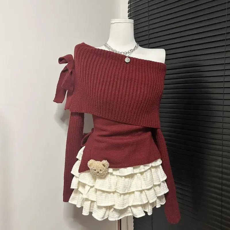 DERMEARNE Autumn Winter Solid Sexy Skirt Set Women Korean Fashion Slash Neck Vintage Elegant Bow Sweater A-line Cake Skirts Two-Piece Sets