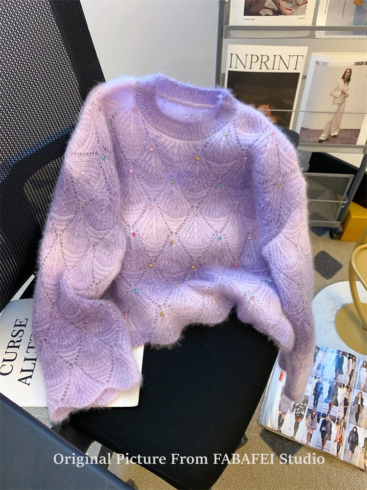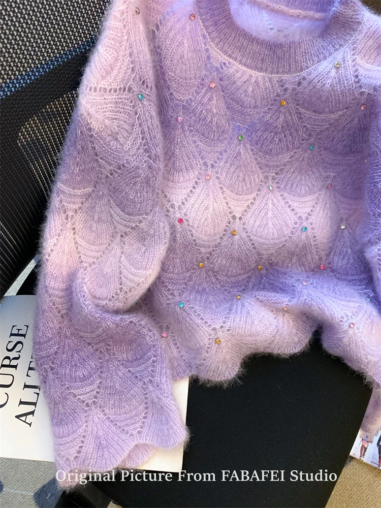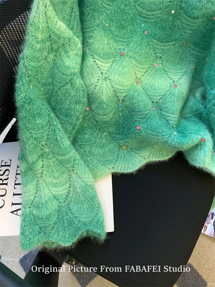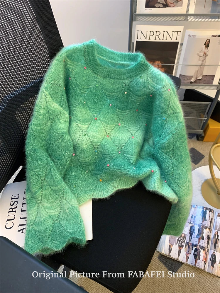 DERMEARNE Autumn Winter Woman French Pullovers Gradient Sweater Long Sleeve O-neck Crop Pullovers Knitwears Korean Jerseys Designer Mohair