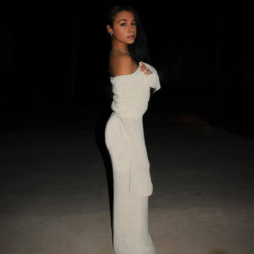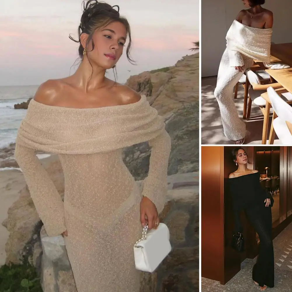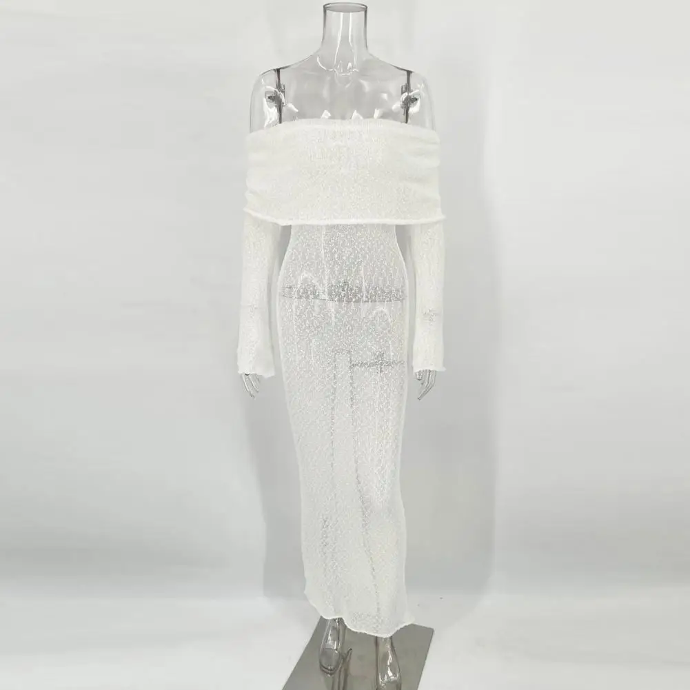 Knit Maxi Dress for Women Long Sleeve Sheer Hollow Off Shoulder Elegant Long Dress for Parties Beach