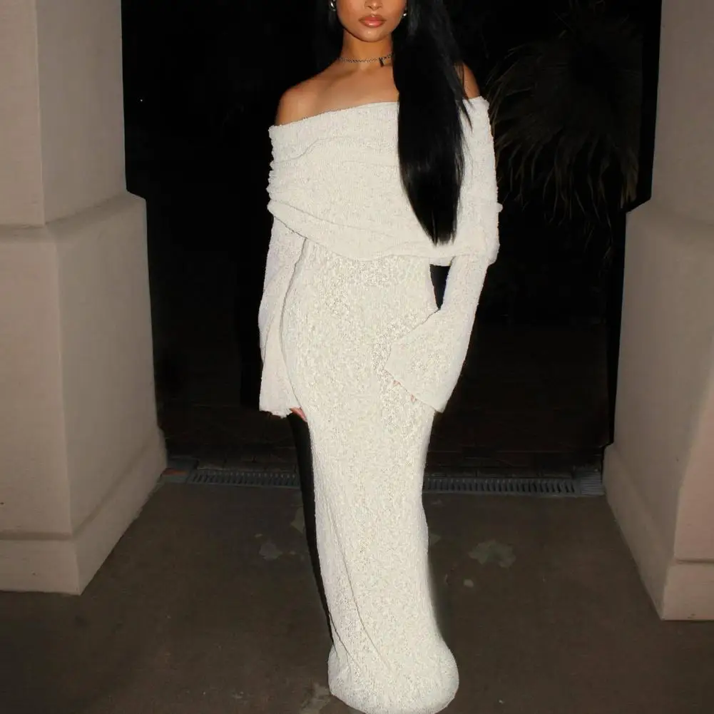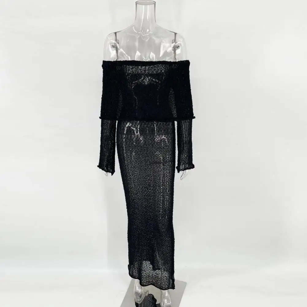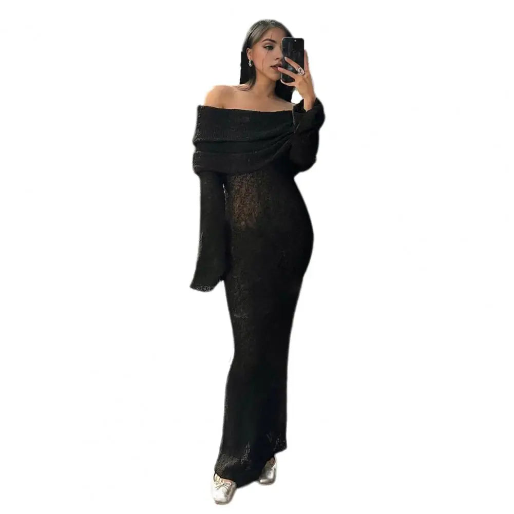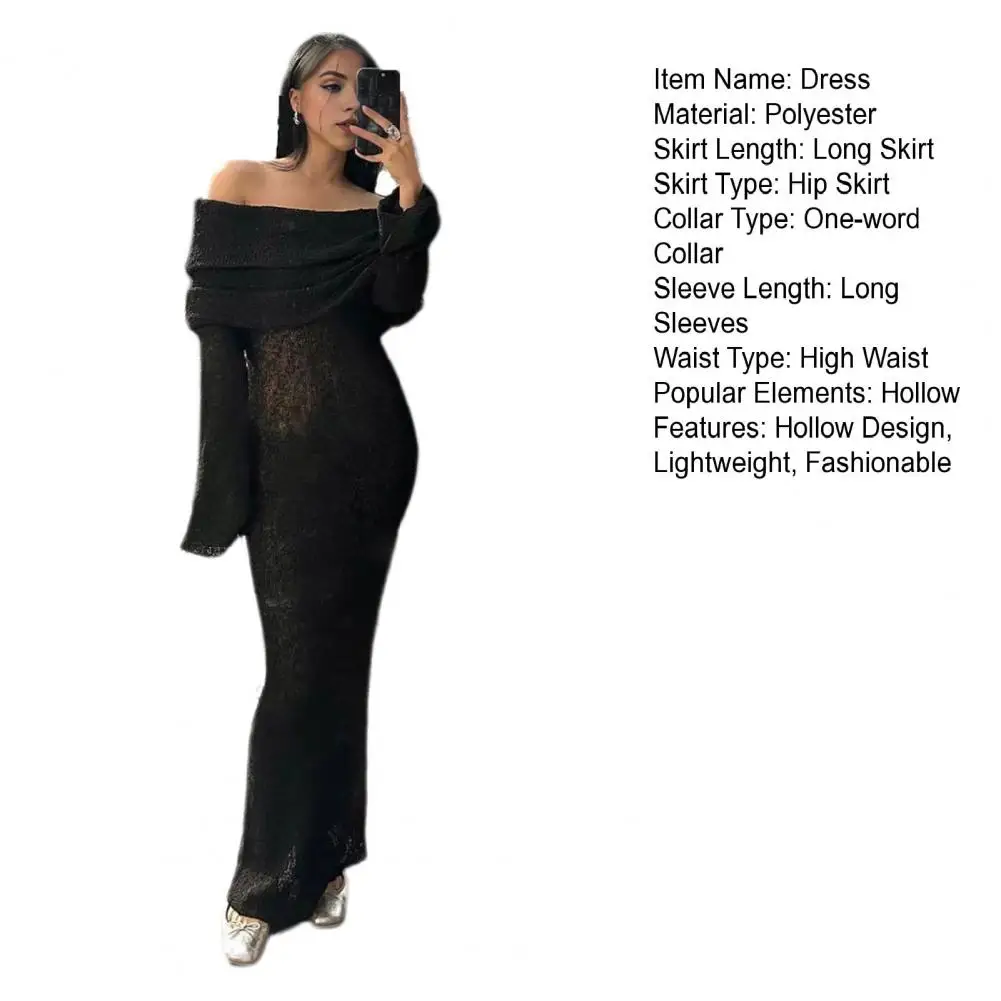 DERMEARNE Autumn Winter Women Knit Dress Elegant Long Sleeve Sheer Hollow Long Dress Sexy Off Shoulder One-line Collar Party Dress