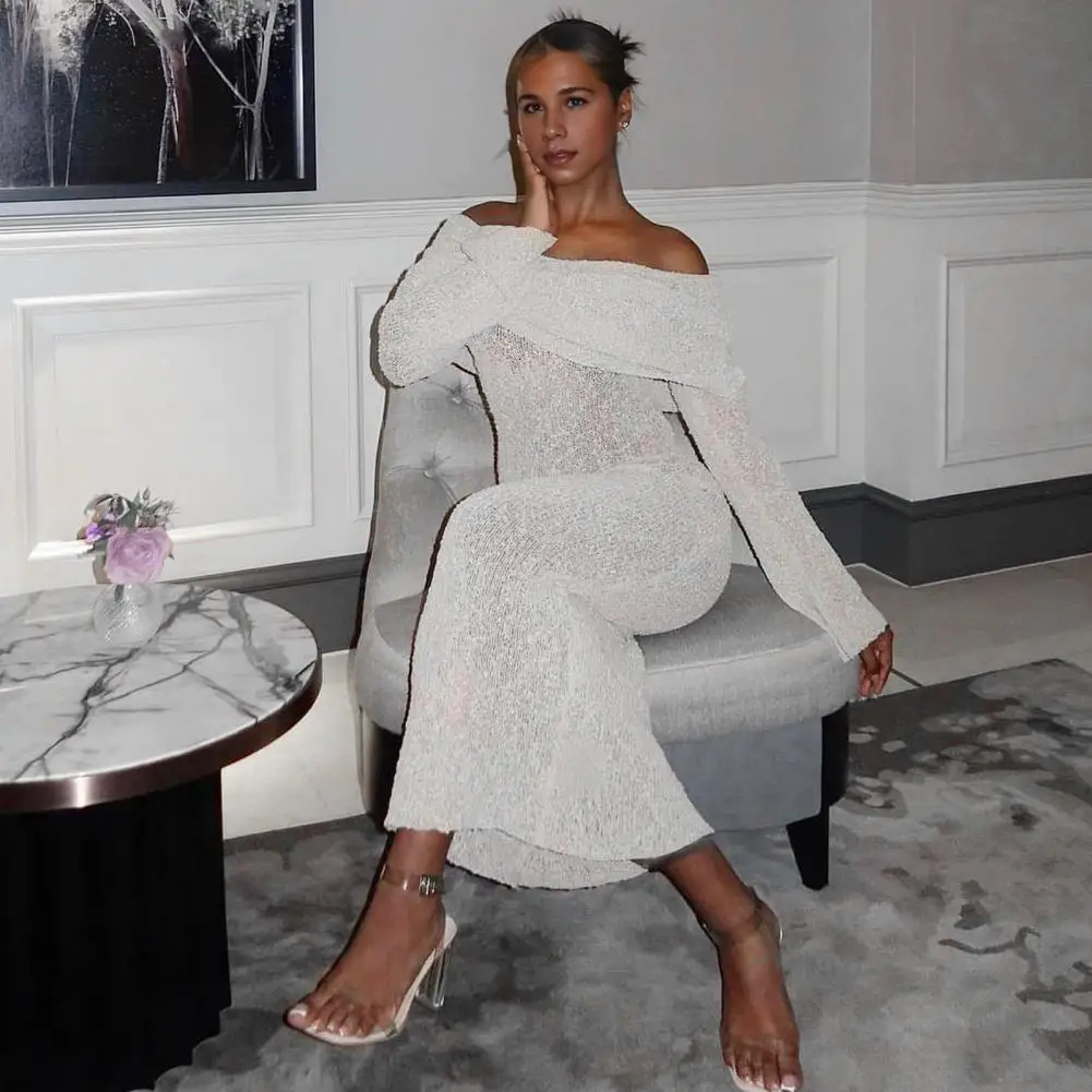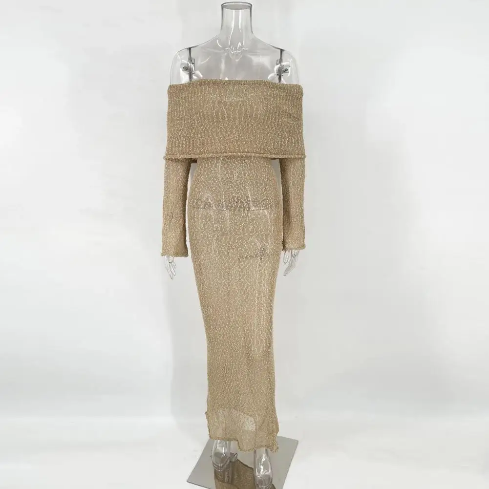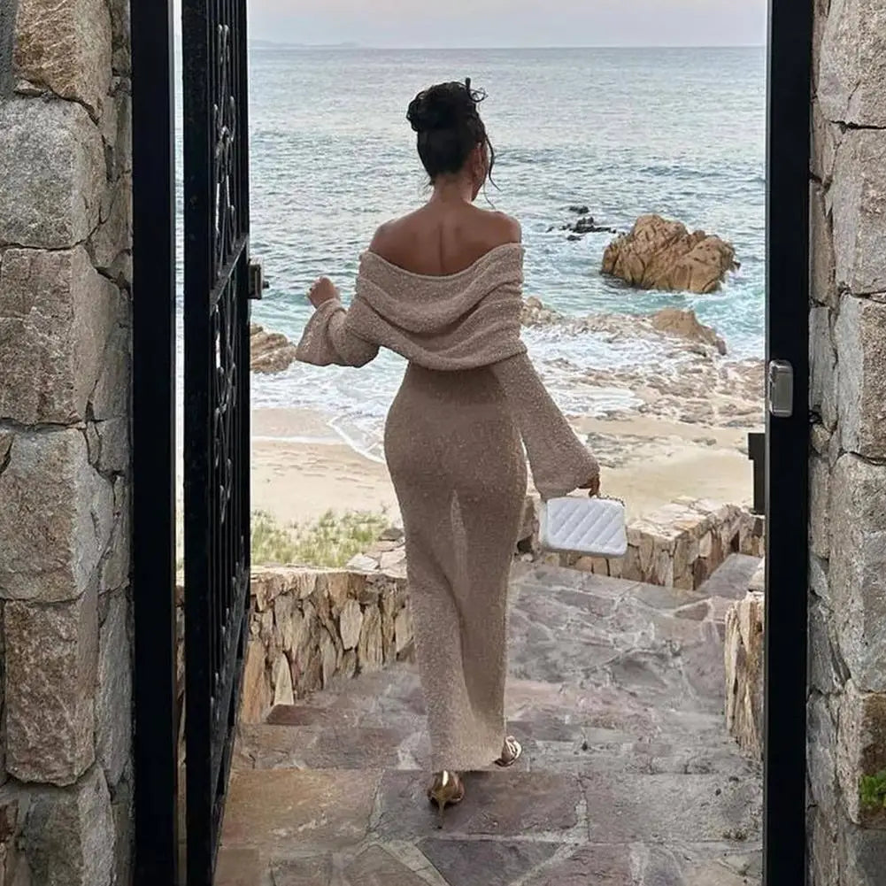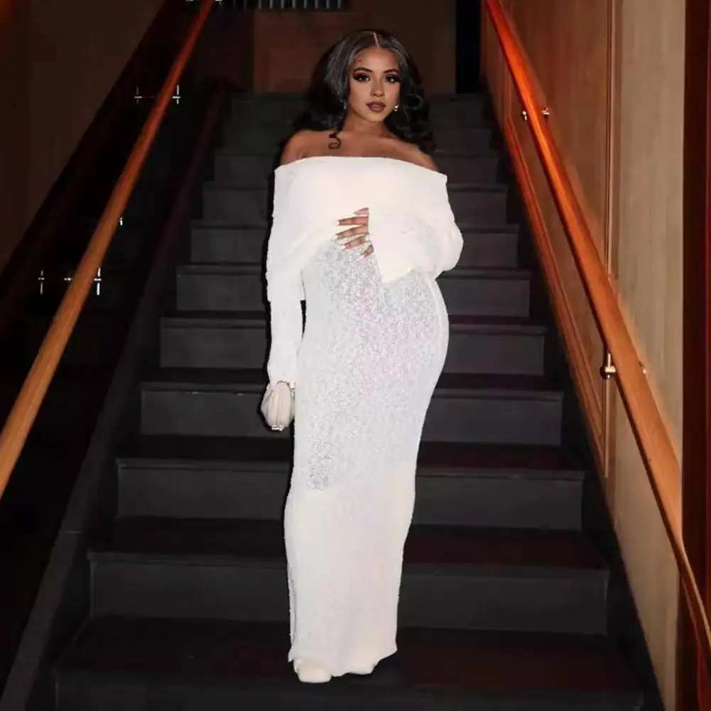 DERMEARNE Autumn Winter Women Knit Dress Elegant Long Sleeve Sheer Hollow Long Dress Sexy Off Shoulder One-line Collar Party Dress
