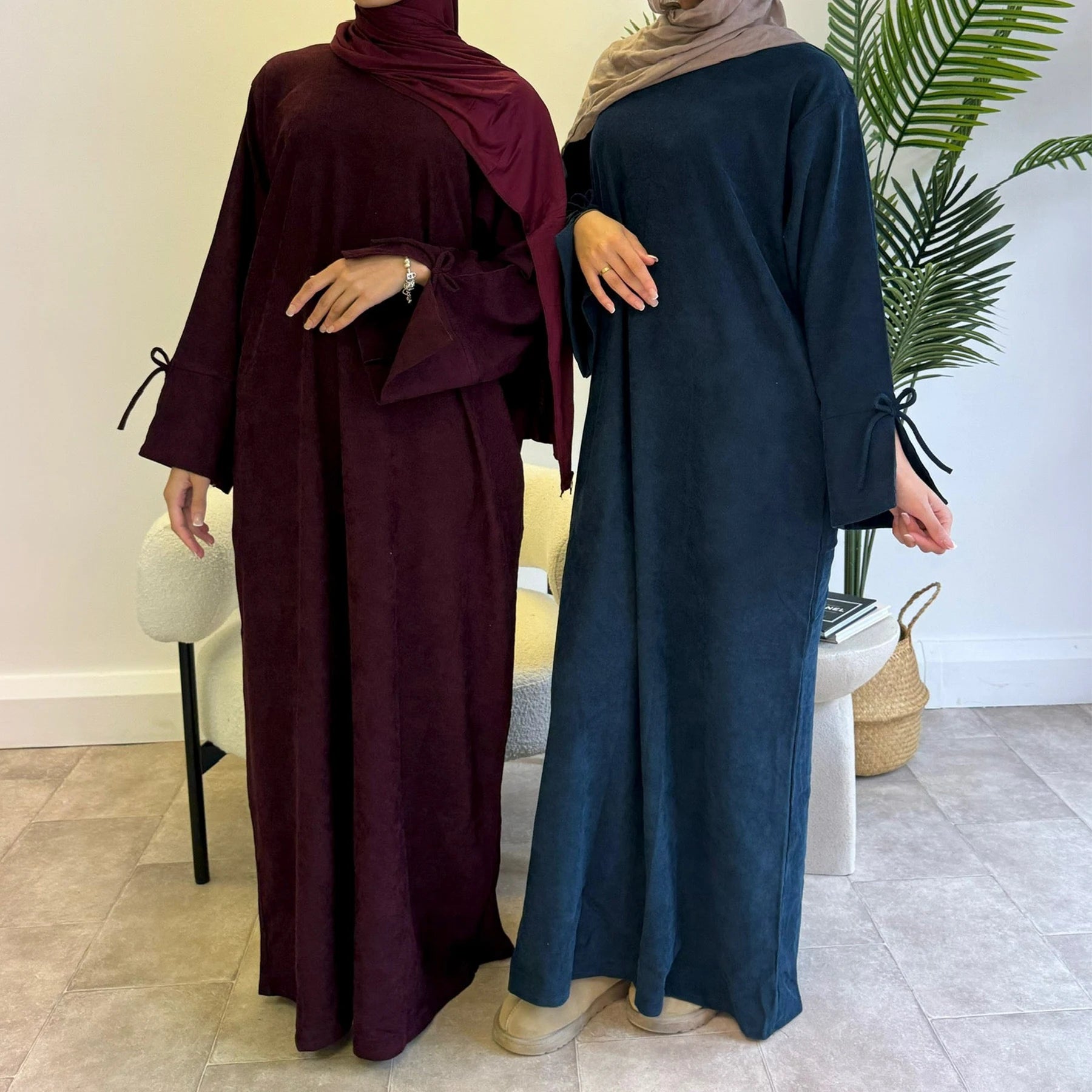 DERMEARNE Bowknot Decorations Corduroy Abaya Muslim Women Dress, O Neck Side Pockets, Warm Loose Modest Islam Hijabi Robe, Ramadan, Autumn