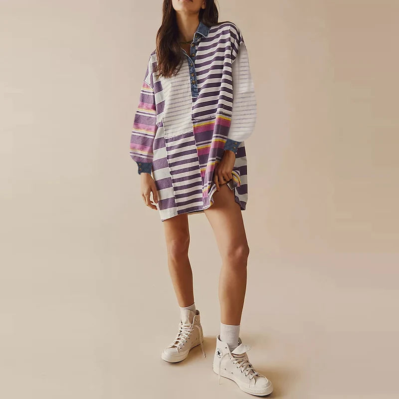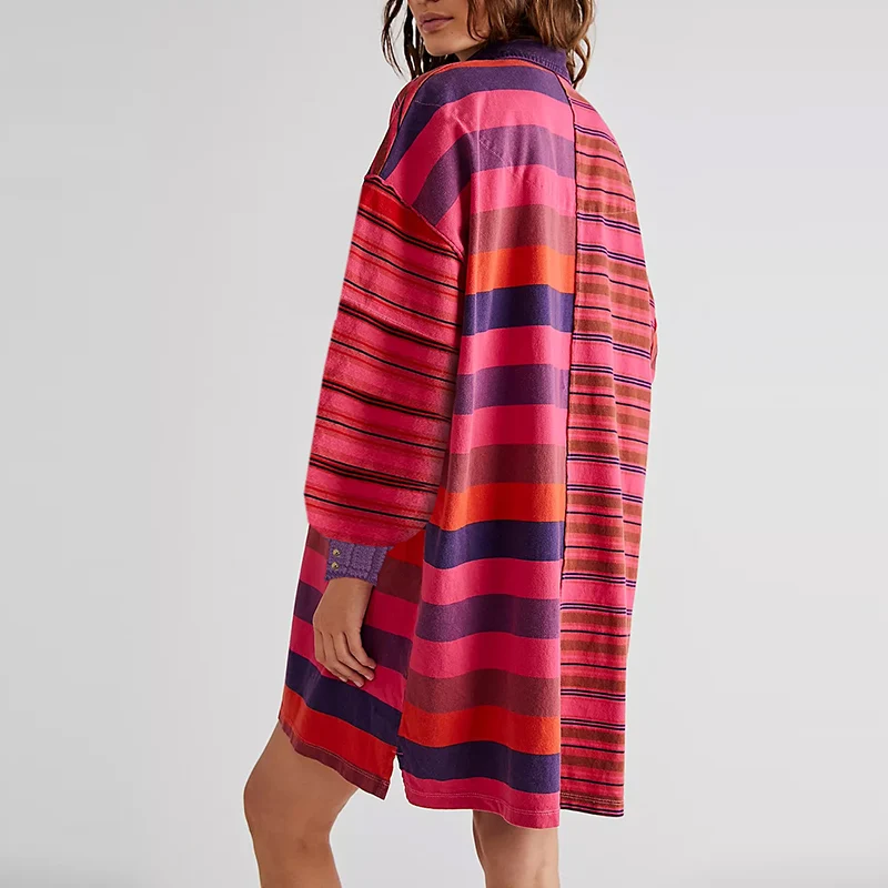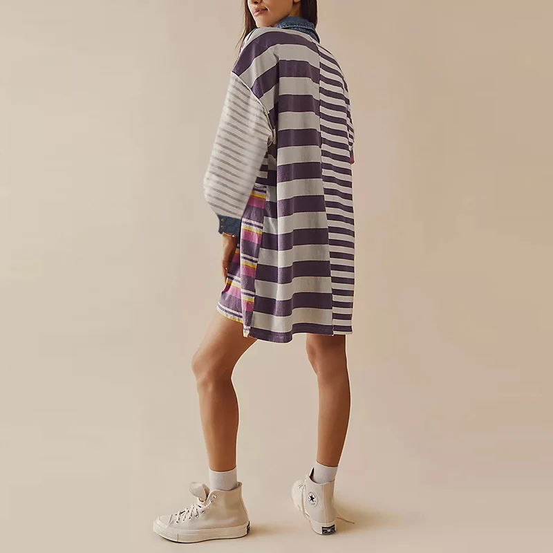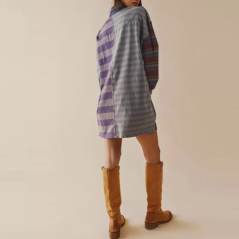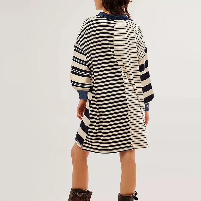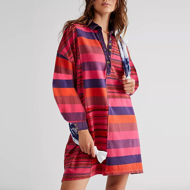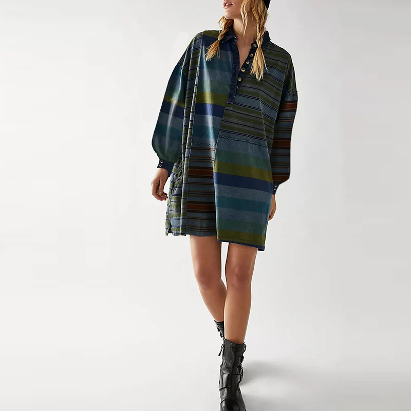 DERMEARNE Casual High Street Button Short Dresses Vintage Striped Printed Summer Dress New Women's Lapel Half Sleeved Loose Dress Vestidos