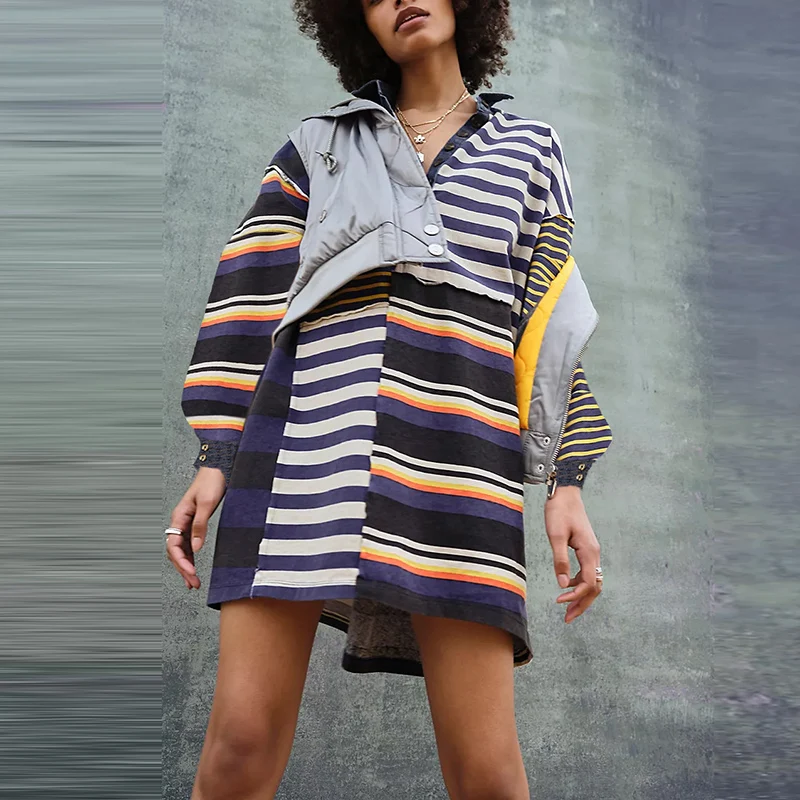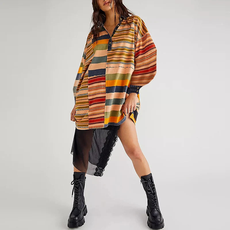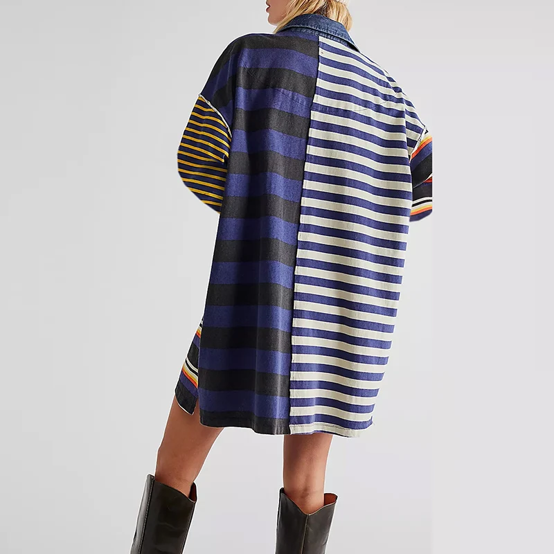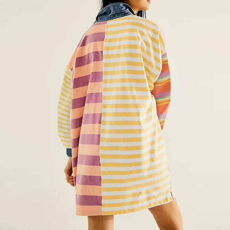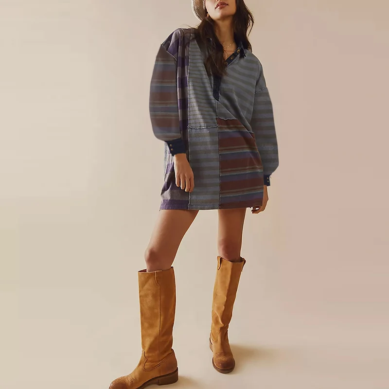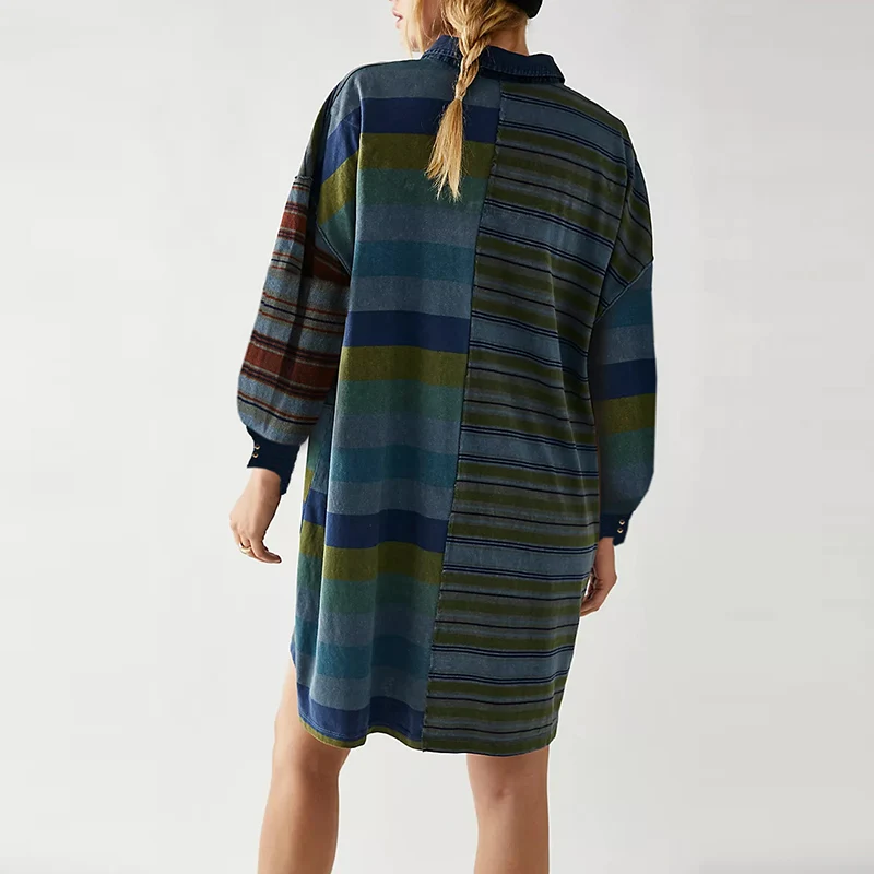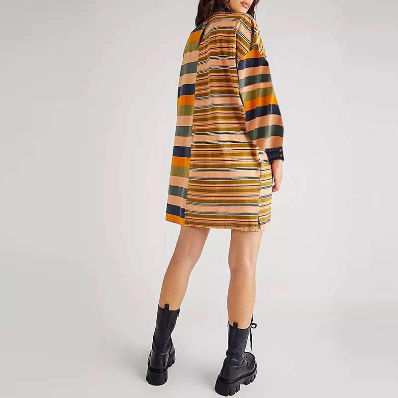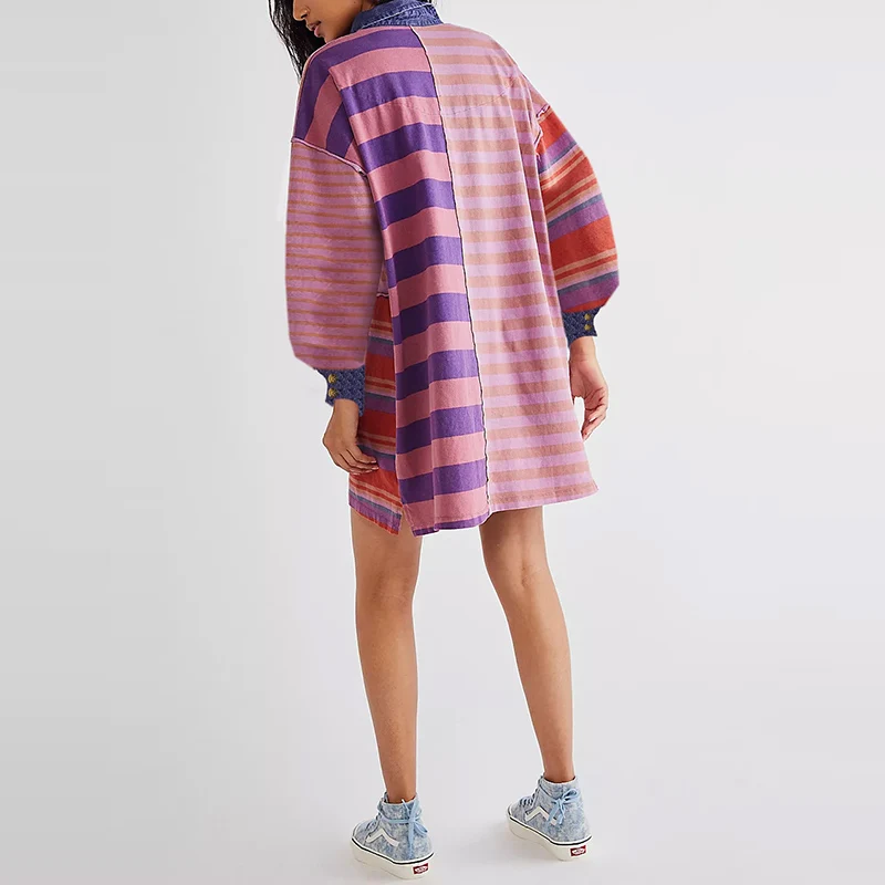 DERMEARNE Casual High Street Button Short Dresses Vintage Striped Printed Summer Dress New Women's Lapel Half Sleeved Loose Dress Vestidos