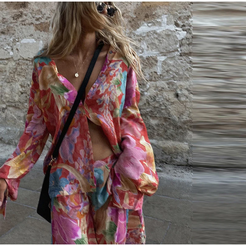 DERMEARNE Casual Printed Shirts Wide Leg Pants Woman's Set Vintage Printing Single Breasted High Waist Pants Sets Female Chic Street Beach