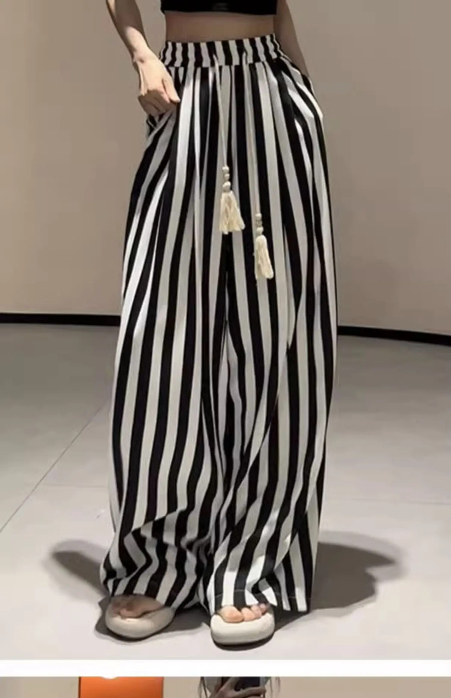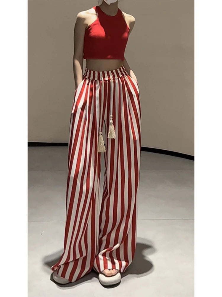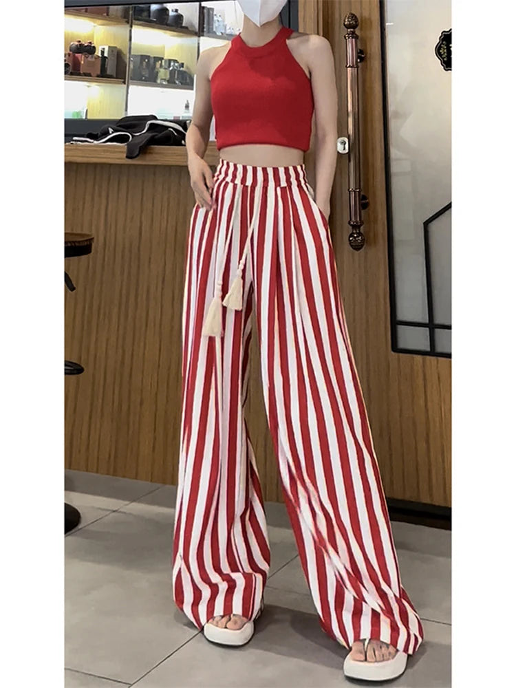 DERMEARNE Casual Retro Striped Print High Waist Wide Leg Pants Women's Fashion Loose Vintage Soft Full Length Trousers 2025 Summer