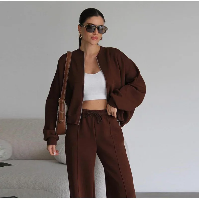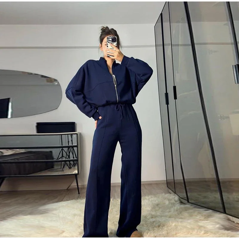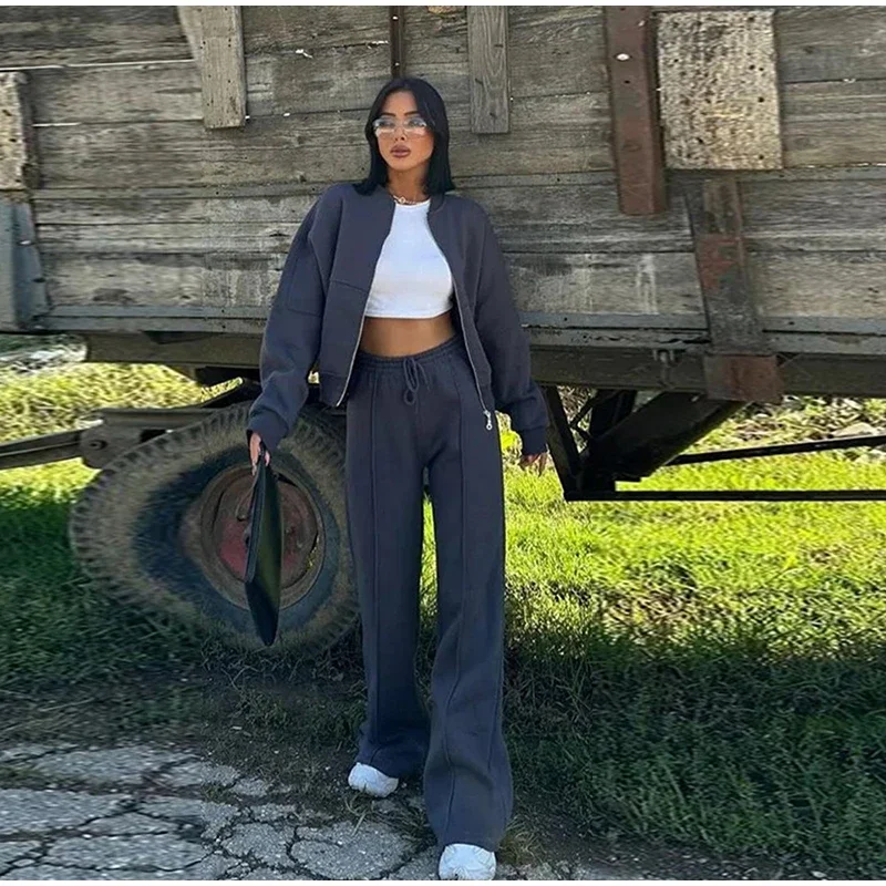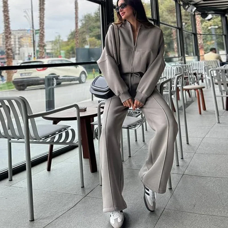 DERMEARNE Casual Sweatshirt Pants Set Women Spring Autumn Zippers O-neck Jacket Loose Lace-up Elastic Waist Trousers Suits Lady Solid
