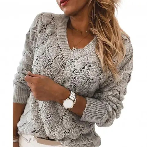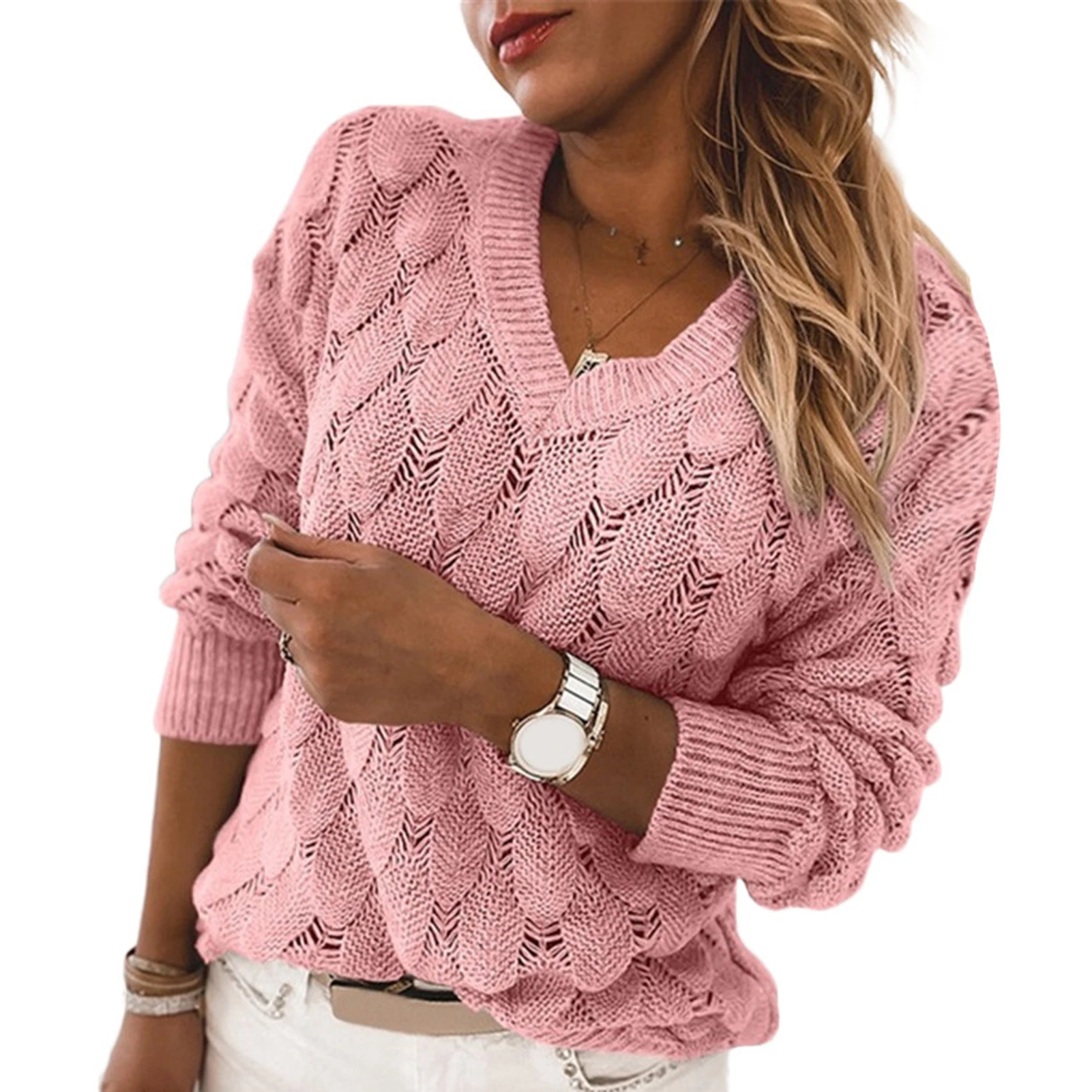 Women Knit Sweater Autumn Winter Hollow Out Feather Long Sleeve V Neck Pullover