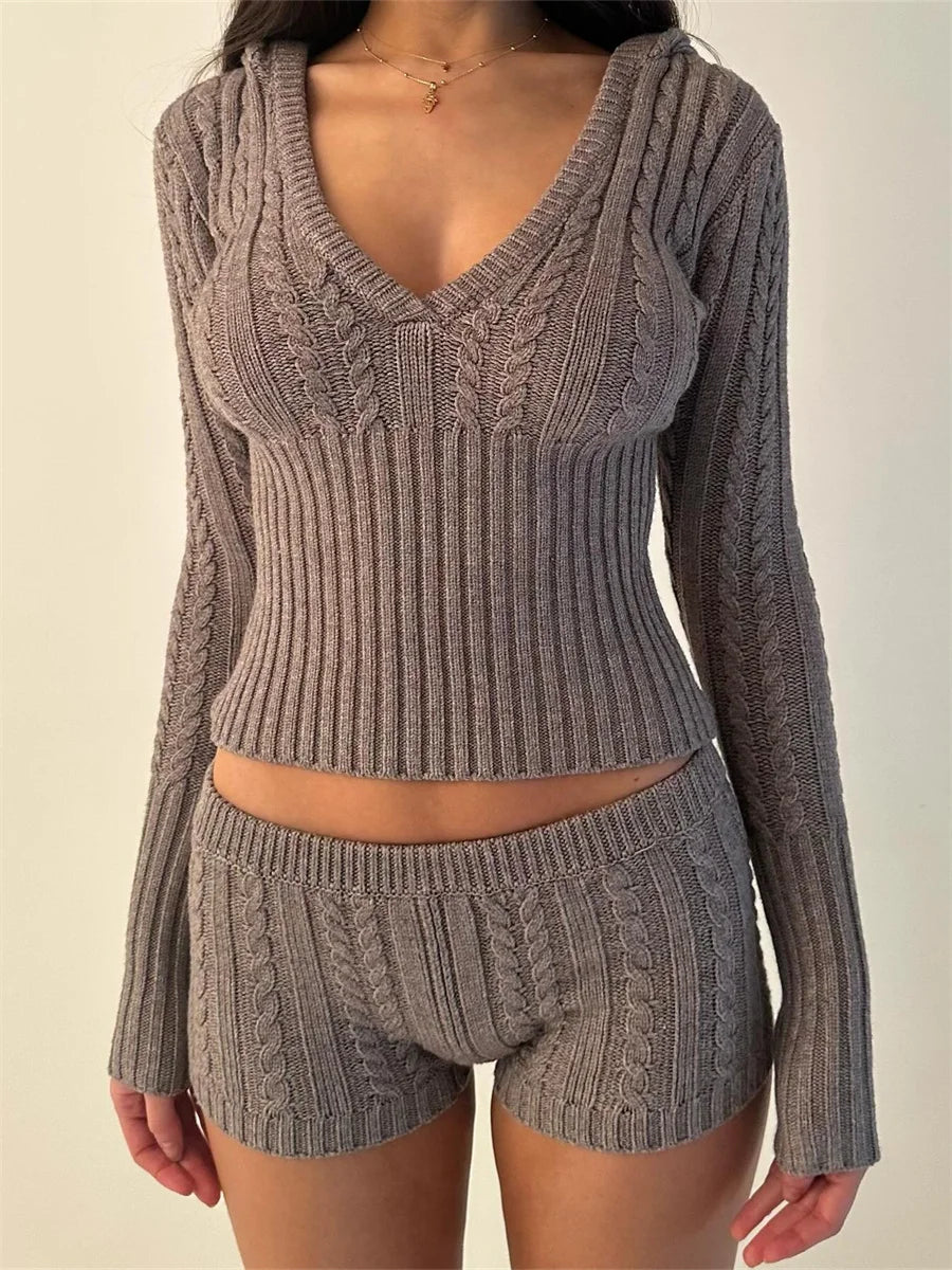 DERMEARNE Chic 2 Piece Set Women Twist V Neck Cropped Sweater and Mini Shorts Sets Y2K Aesthetic Casual Knit Pullovers Short Pant Suit