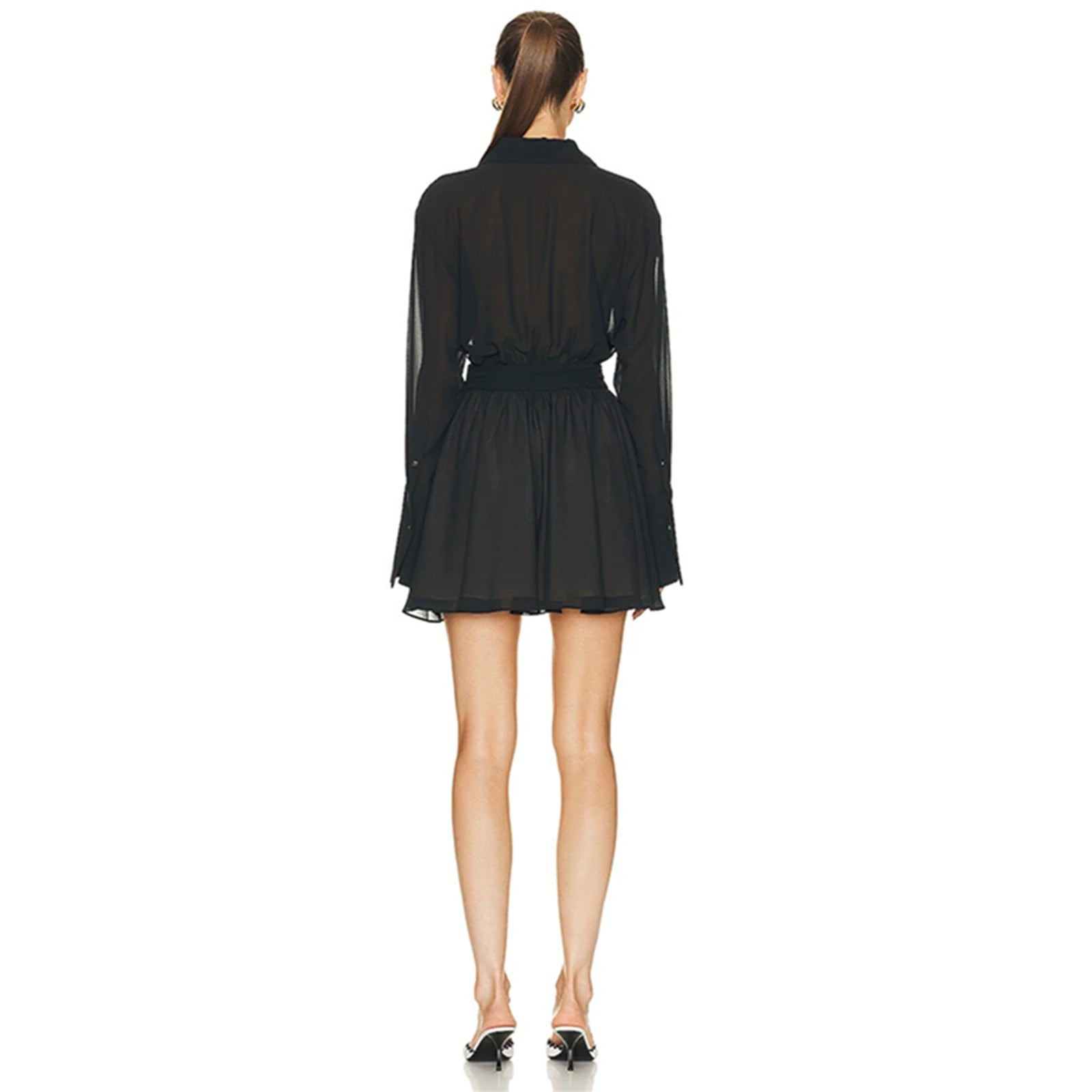 DERMEARNE Combhasaki Women Summer Sexy Solid Color See-through Long Sleeve Turn-Down Collar Pleated Waist Ruffled A-line Short Shirt Dress