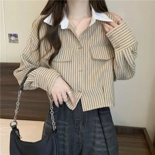 DERMEARNE Contrast Striped Patchwork Short Blouse Spring New Polo Neck Long Sleeve Loose Fashion Shirt Tops Office Casual Women Clothing