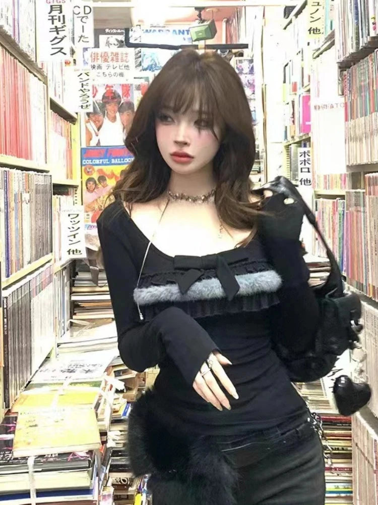 DERMEARNE Coquette Sexy Kawaii T Shirts Women Korean Style Y2k Vintage Streetwear Bow Patchwork Square Collar Slim Tees Tops 2025