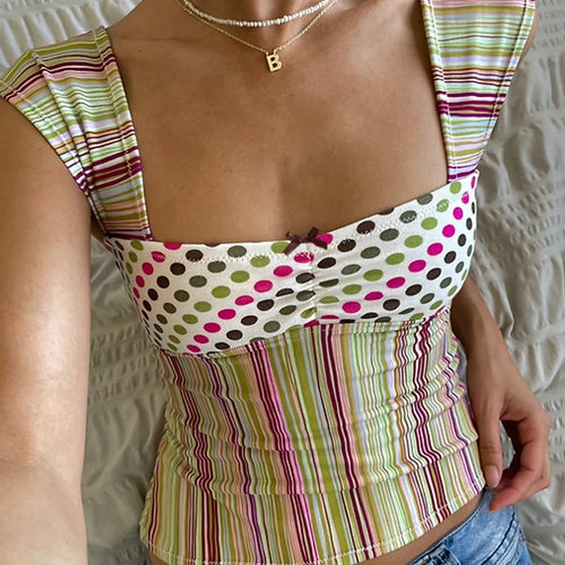 DERMEARNE Cottage Y2K Aesthetic Bow Trim Milkmaid Crop Top Plaid/Stripes Print Square Neck Tank Tops Women Backless Slim Fit Shirts Vest