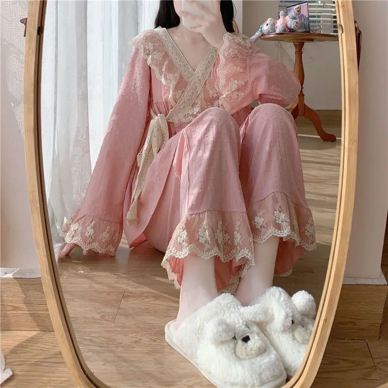 DERMEARNE Cotton Sleepwear Women Lace Kawaii Clothes Long Sleeve Long Pant Pajama Sets Loungewear Korean Kimono Homewear Pijama Mujer