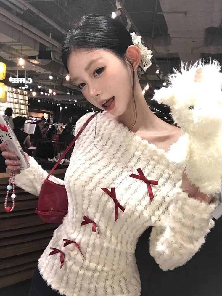 DERMEARNE Deeptown Sweet Bow Knitted Pullover Women Off Shoulder Sexy Long Sleeve Sweaters Korean Style Kawaii Autumn Winter Pullovers