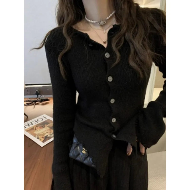 DERMEARNE Y2k Grey Vintage Women Kint Sweater Harajuku Long Sleeve Cardigan Irregular Korean Fashion Slim Autumn Jerseys Casual