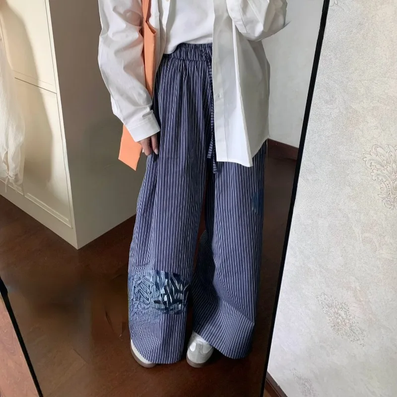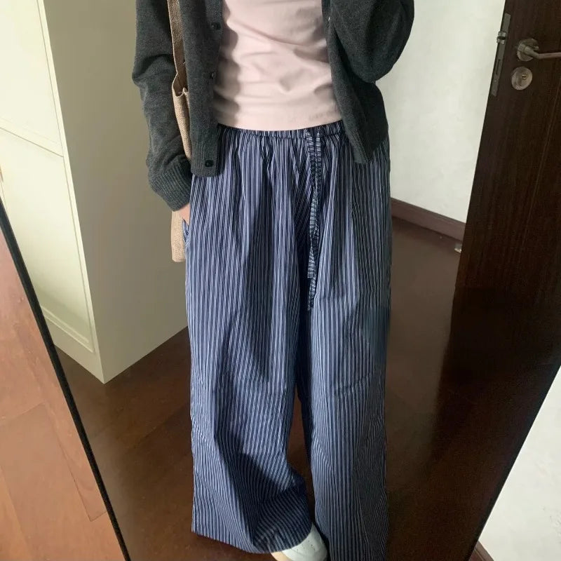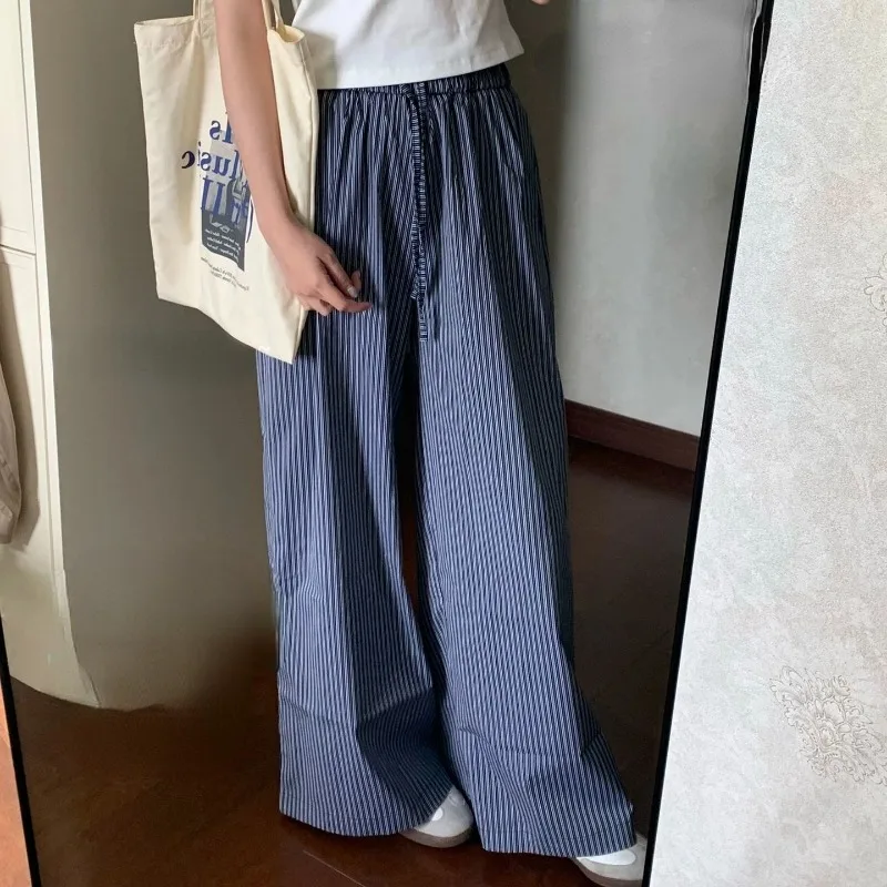 DERMEARNE Deeptown Y2k Vintage Basic Striped Women's Casual Pants Elastic Waist Korean Fashion Slacks Loose Summer Trousers Streetwear