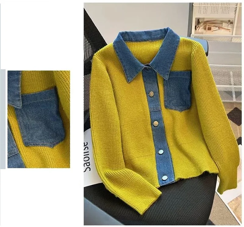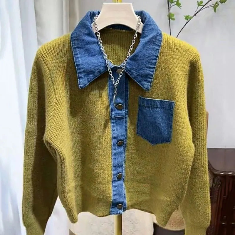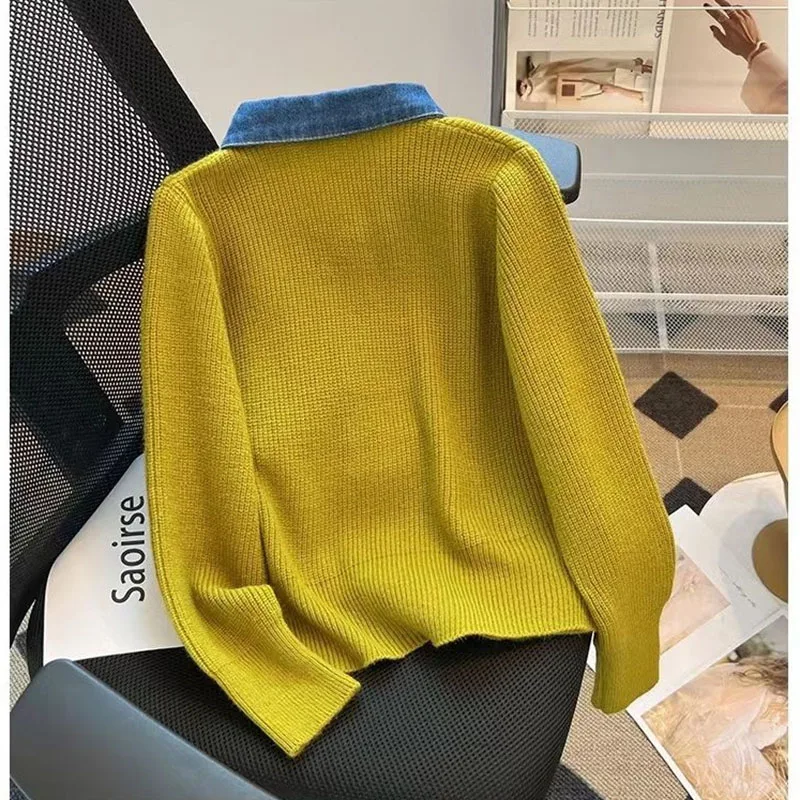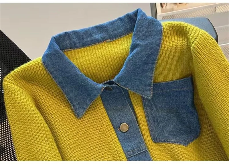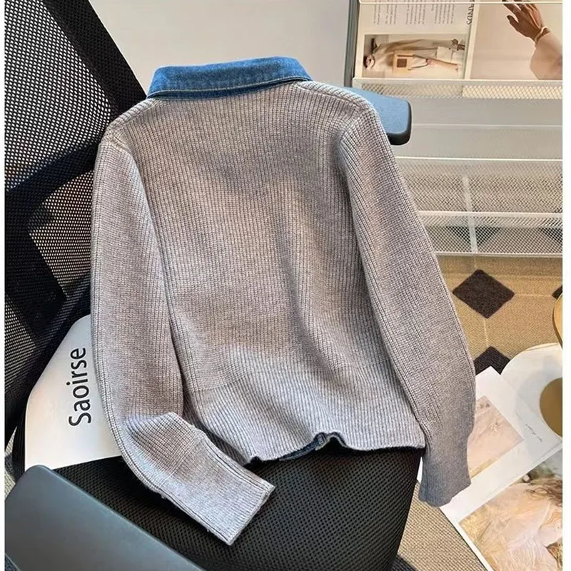 DERMEARNE Design Sense Polo Neck Denim Stitching Sweater Women Early Autumn Winter 2025New Blouse Loose Fashion Long Sleeve Female Sweater