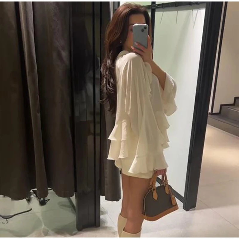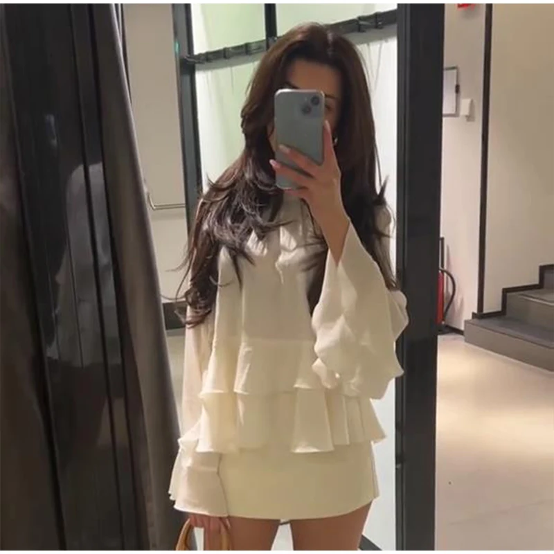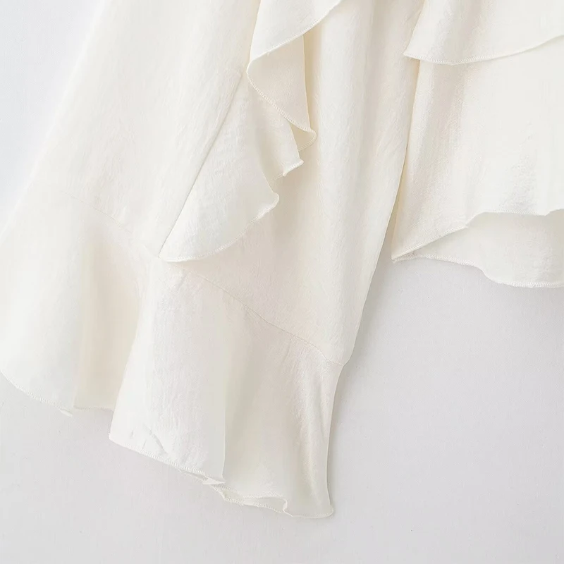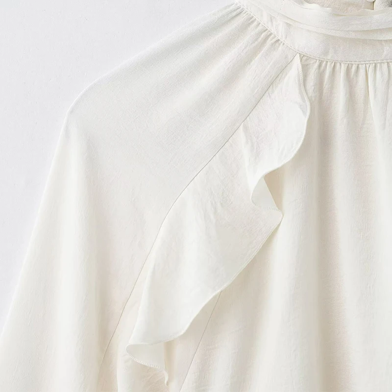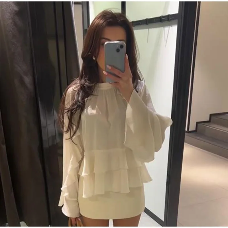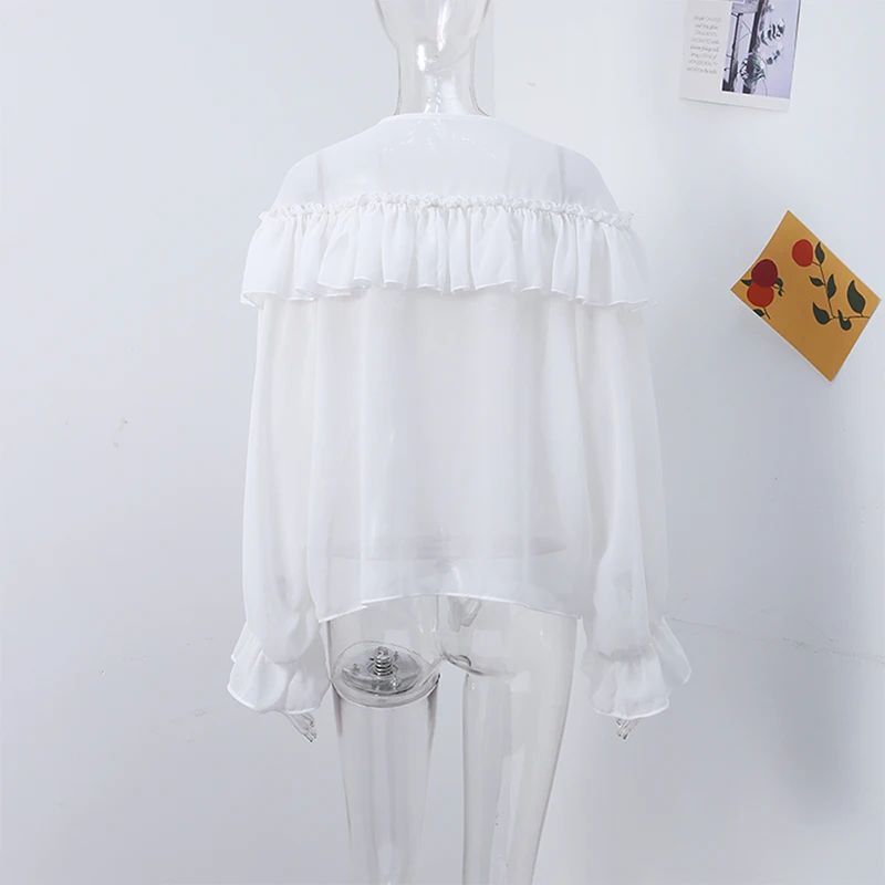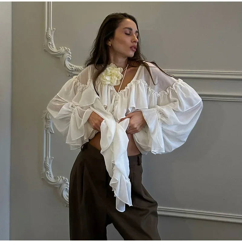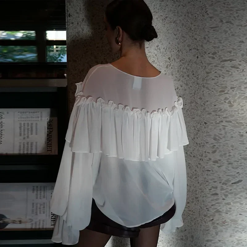 DERMEARNE Elegant Ruffle Solid Women Shirts See Through V-neck Long Lantern Sleeve Lady Top 2025 Spring Office Oversize Female Blouses