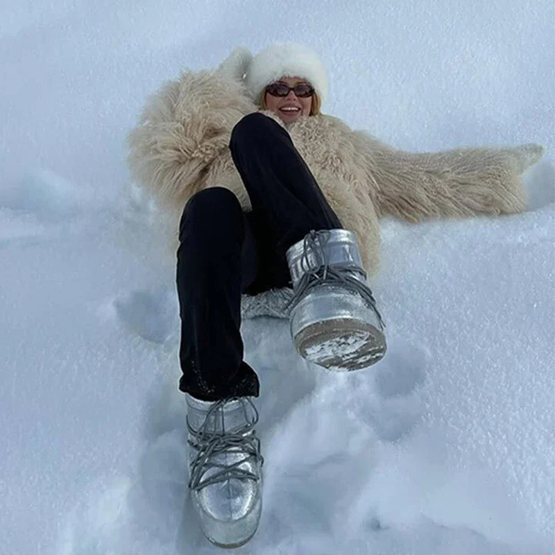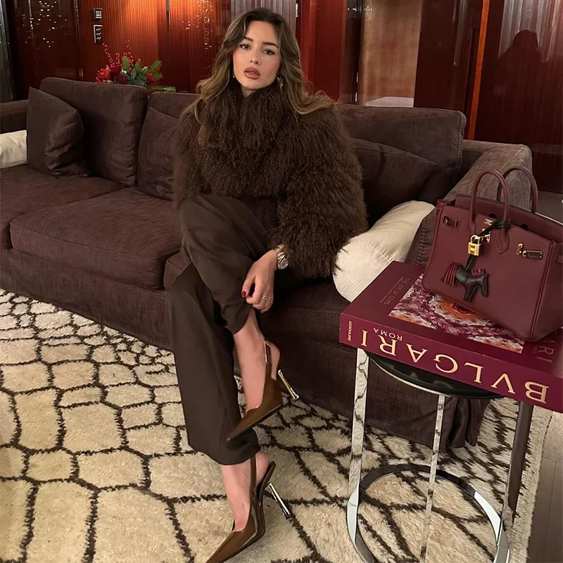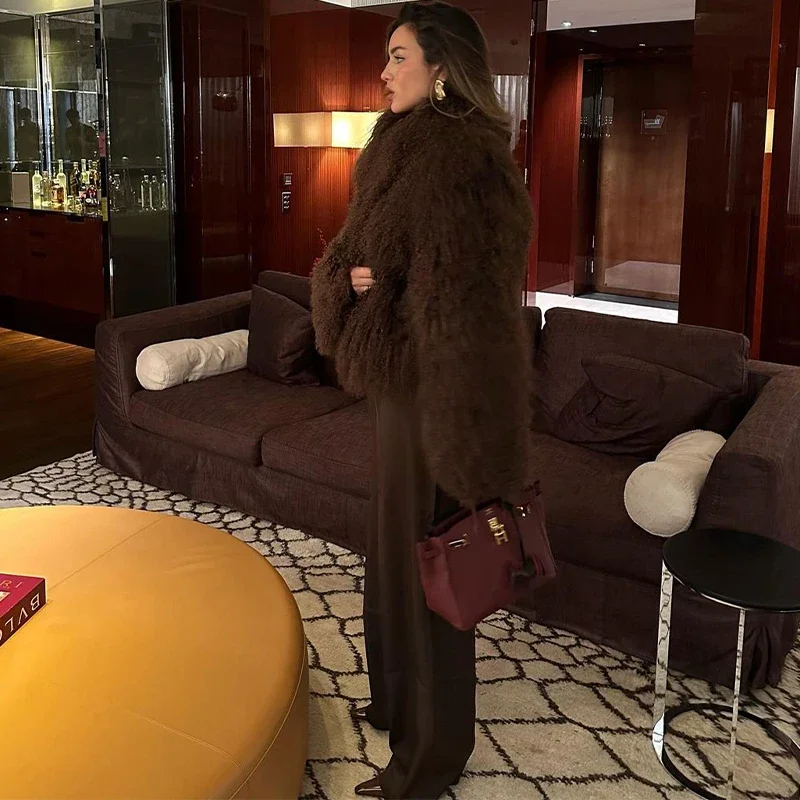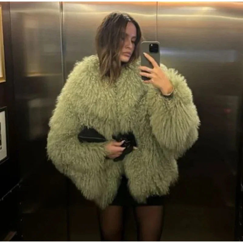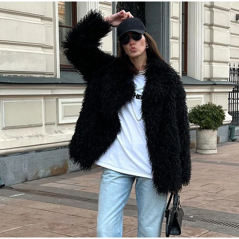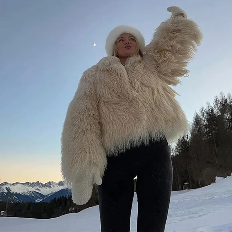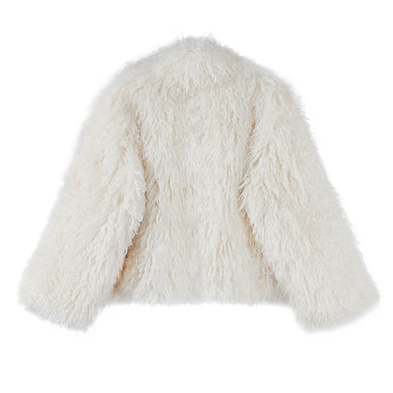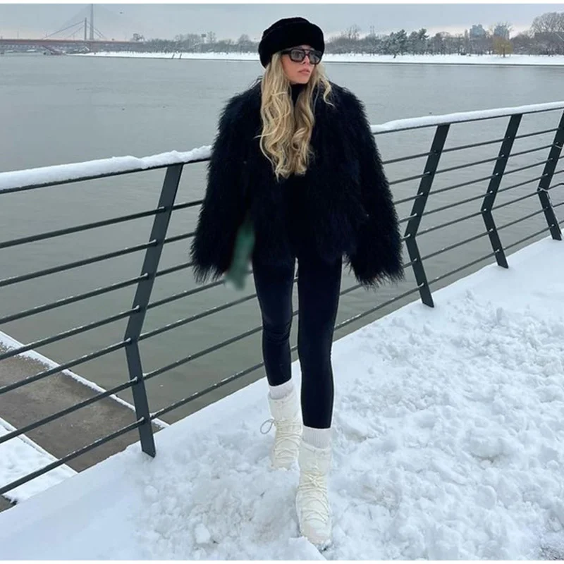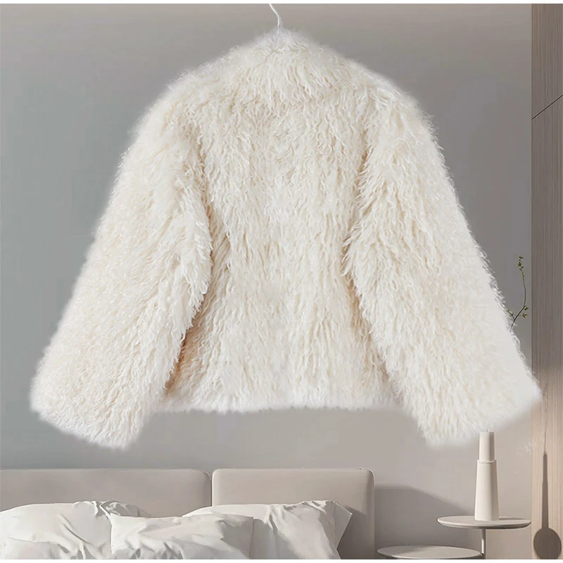 DERMEARNE Elegant Solid Color Thick Faux Fur Coats Women Round Neck Long Sleeve Short Warm Jacket 2025 Winter New High Street Lady Outwear