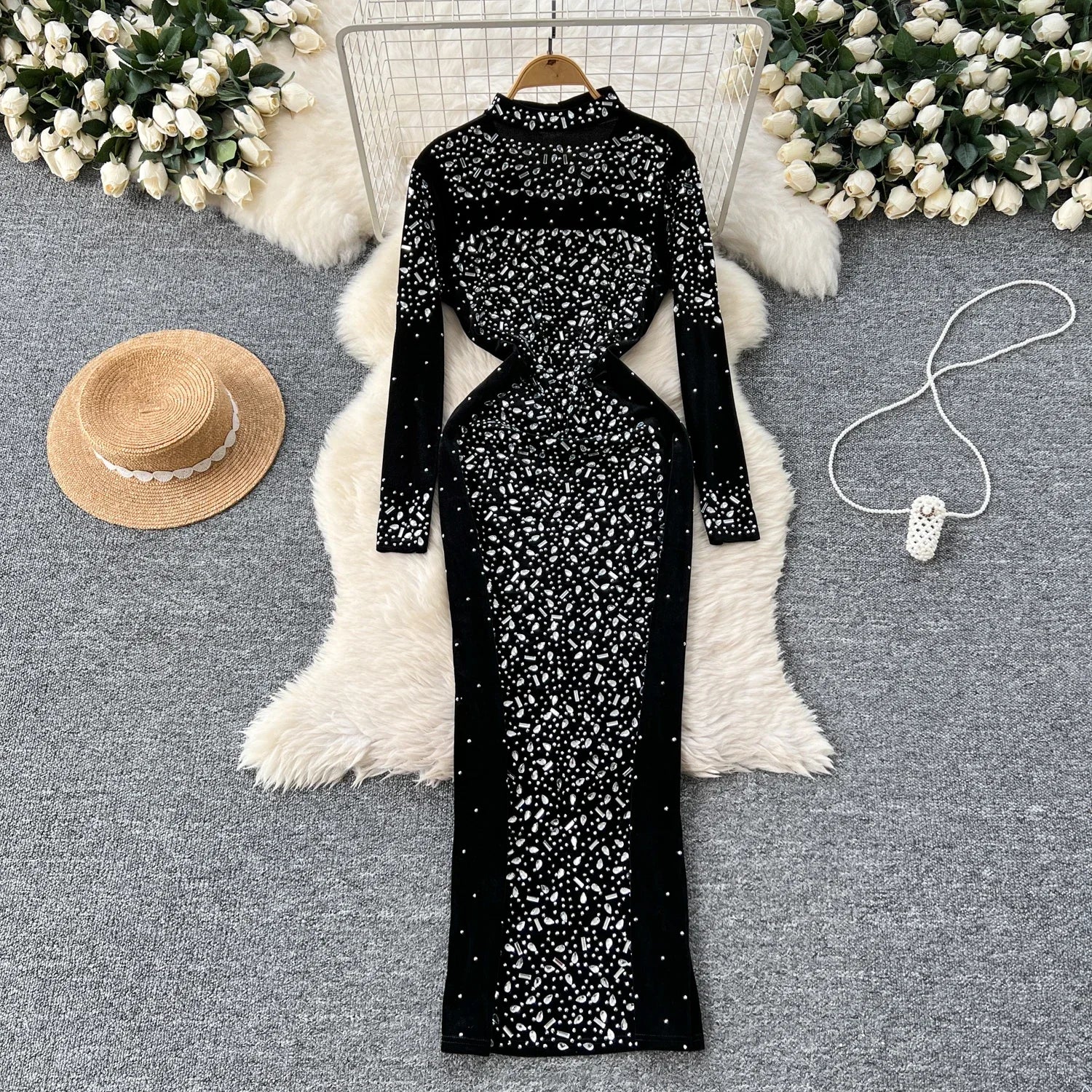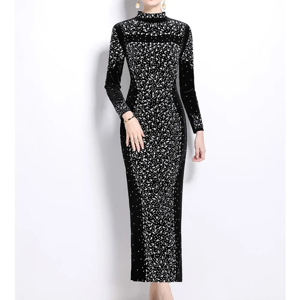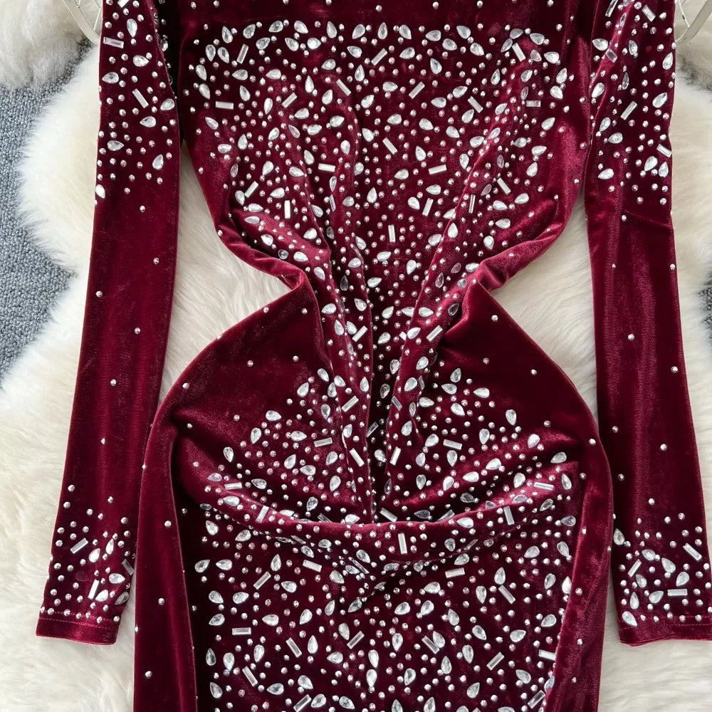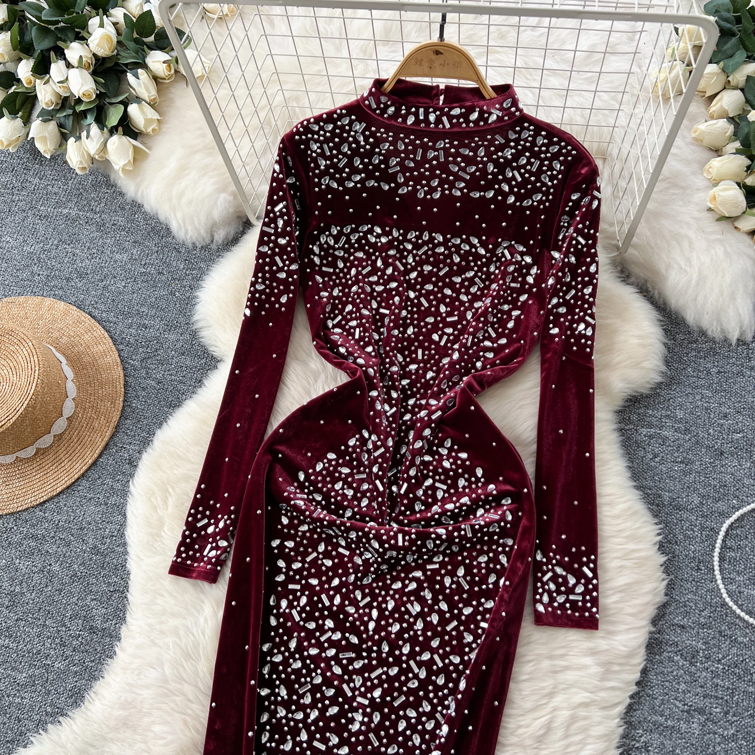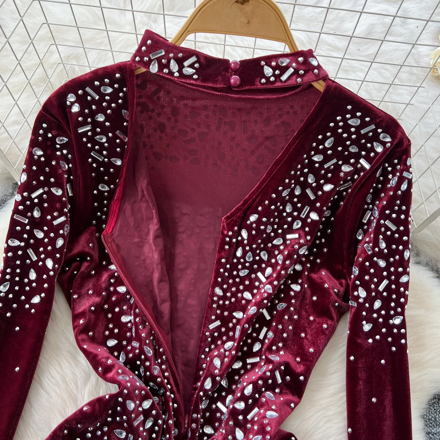DERMEARNE Elegant Stand Neck Vintage Long Sleeve Chic Rhinestone Slim Split Velvet Dress Korean High Street Evening Autumn Winter Clothing