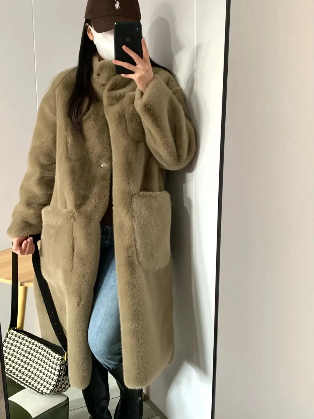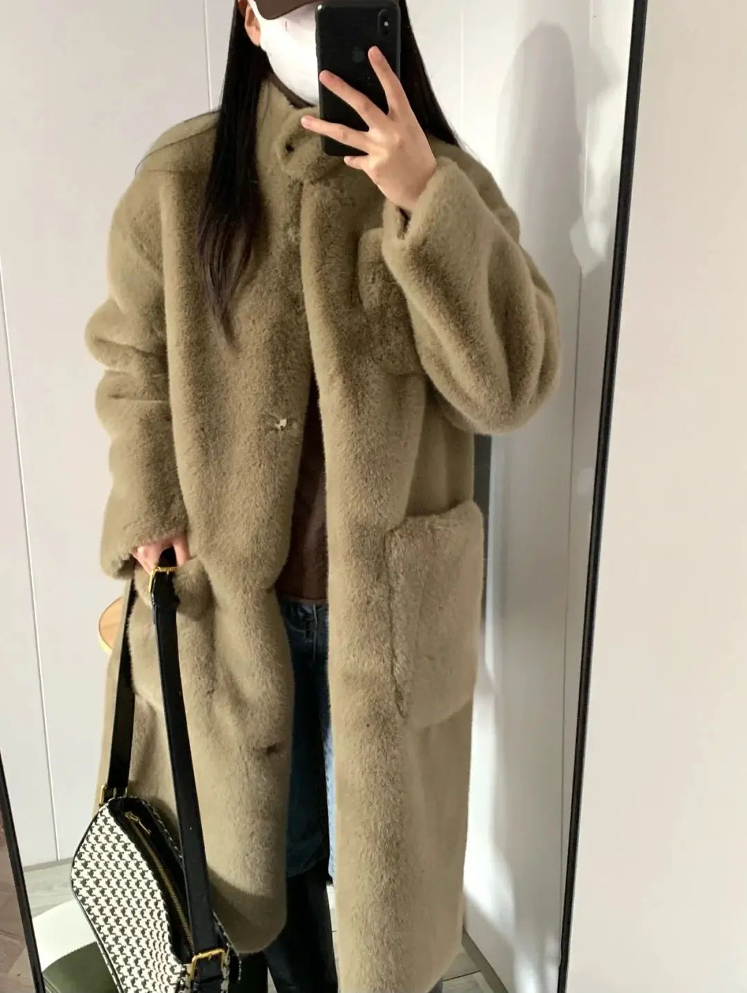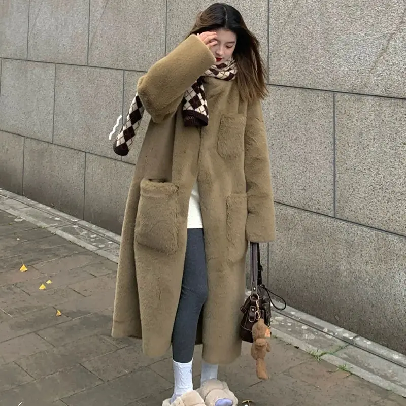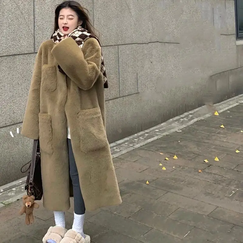 DERMEARNE Environmentally Friendly Fur and Fur Integrated Medium Long Thick Mink Fur Over the Knee Lazy Style Fur Coat for Women