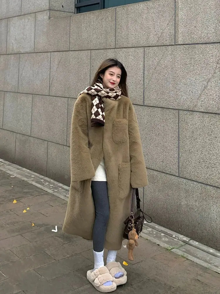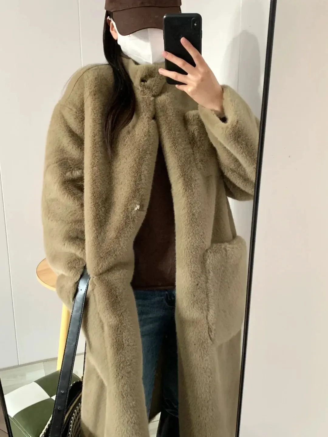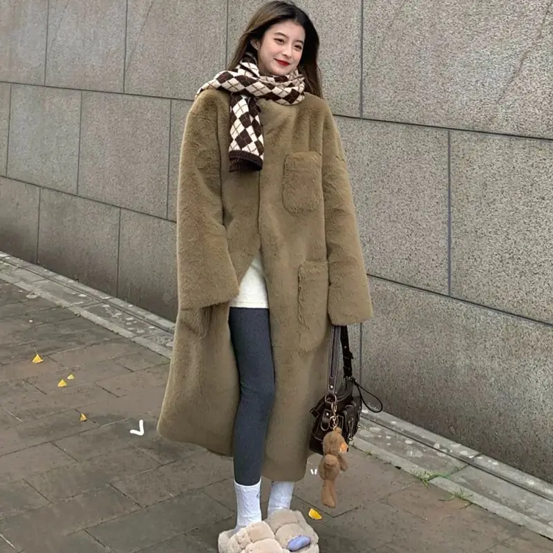 DERMEARNE Environmentally Friendly Fur and Fur Integrated Medium Long Thick Mink Fur Over the Knee Lazy Style Fur Coat for Women