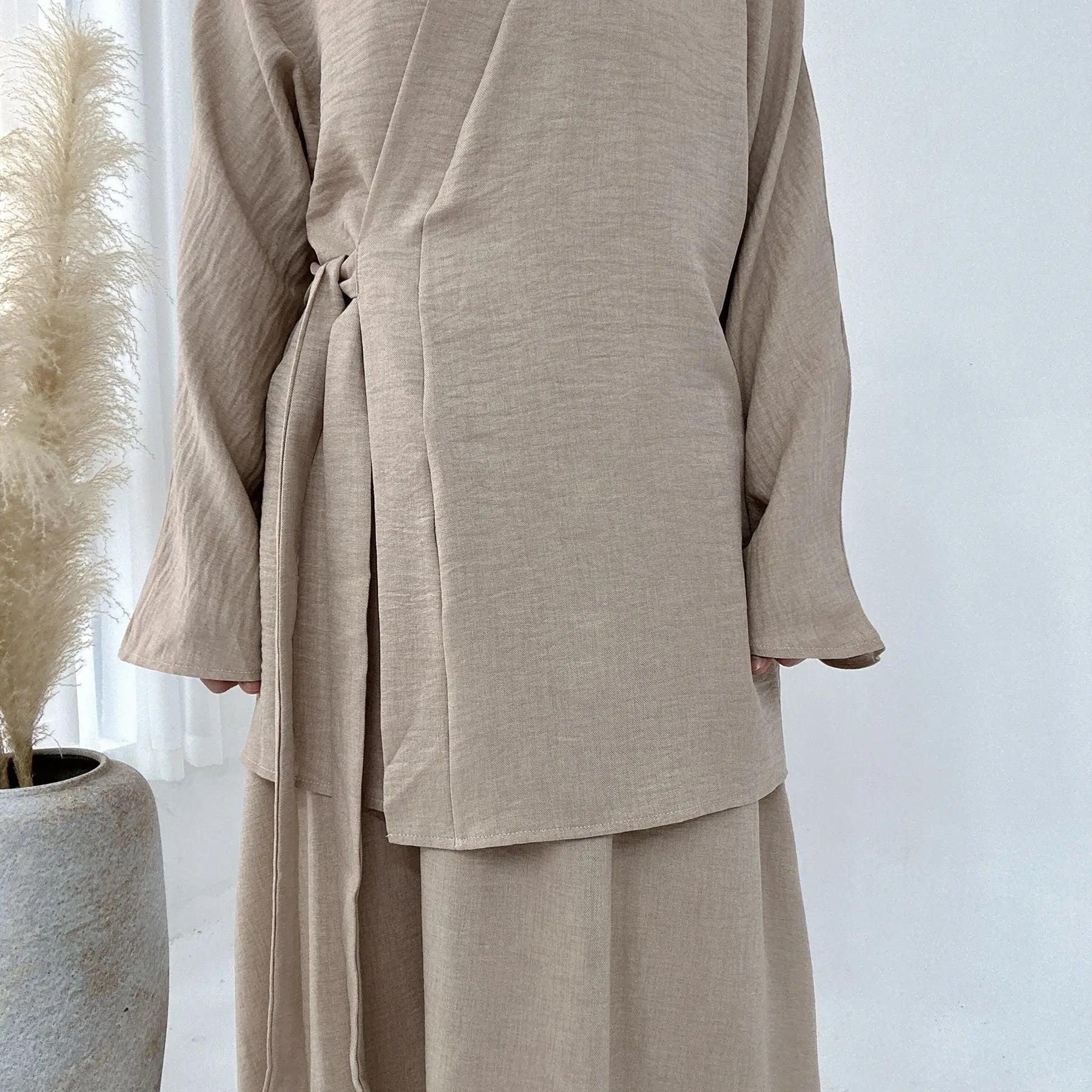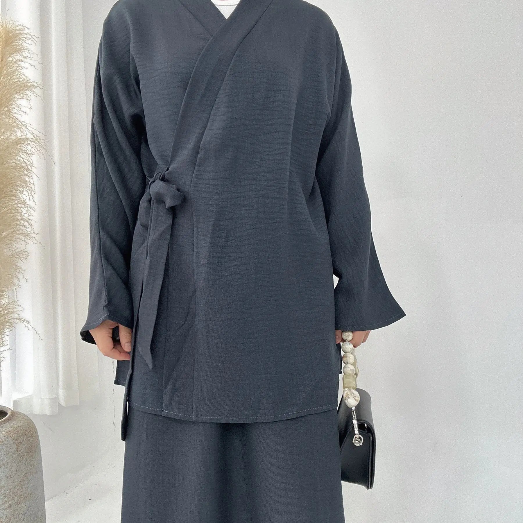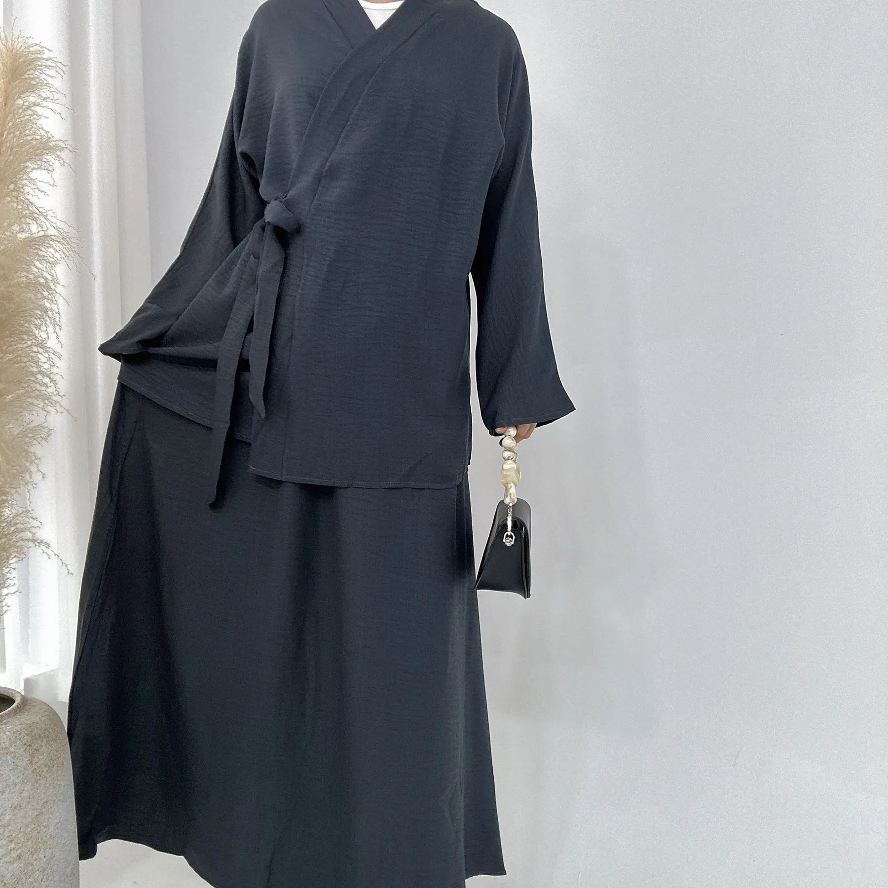 DERMEARNE Fashion Modest Muslim Matching Set 2 Piece Dress Women Kimono Lace Up Tops Skirt Suit Dubai Turkey Kaftan Abaya Ramadan Outfits