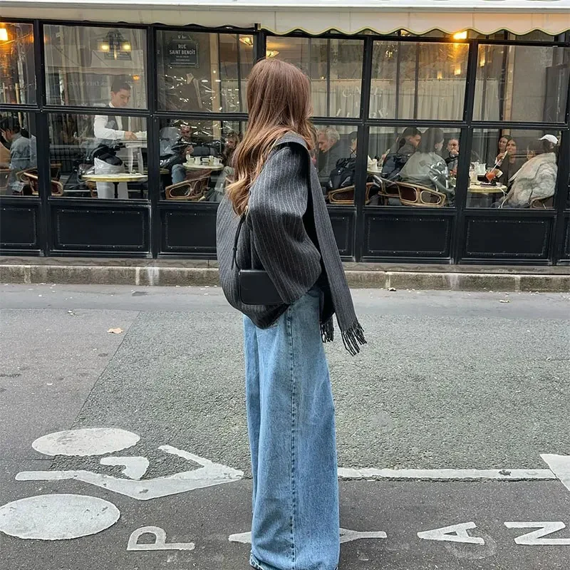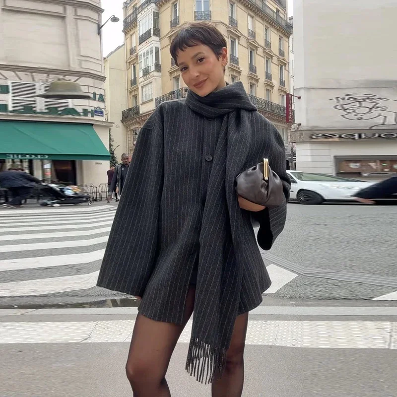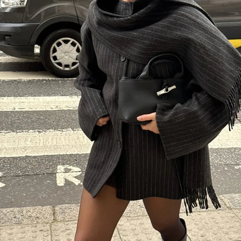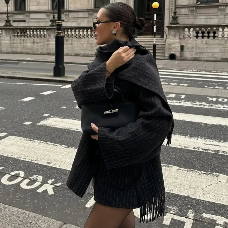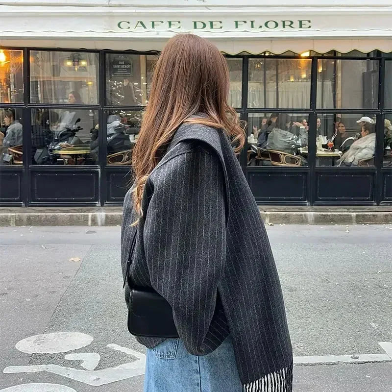 DERMEARNE Fashion Striped Scarf Collar Short Jacket Women Elegant Wool Blend Single Breasted Crop Coat 2025 New Autumn Street Warm Outwear