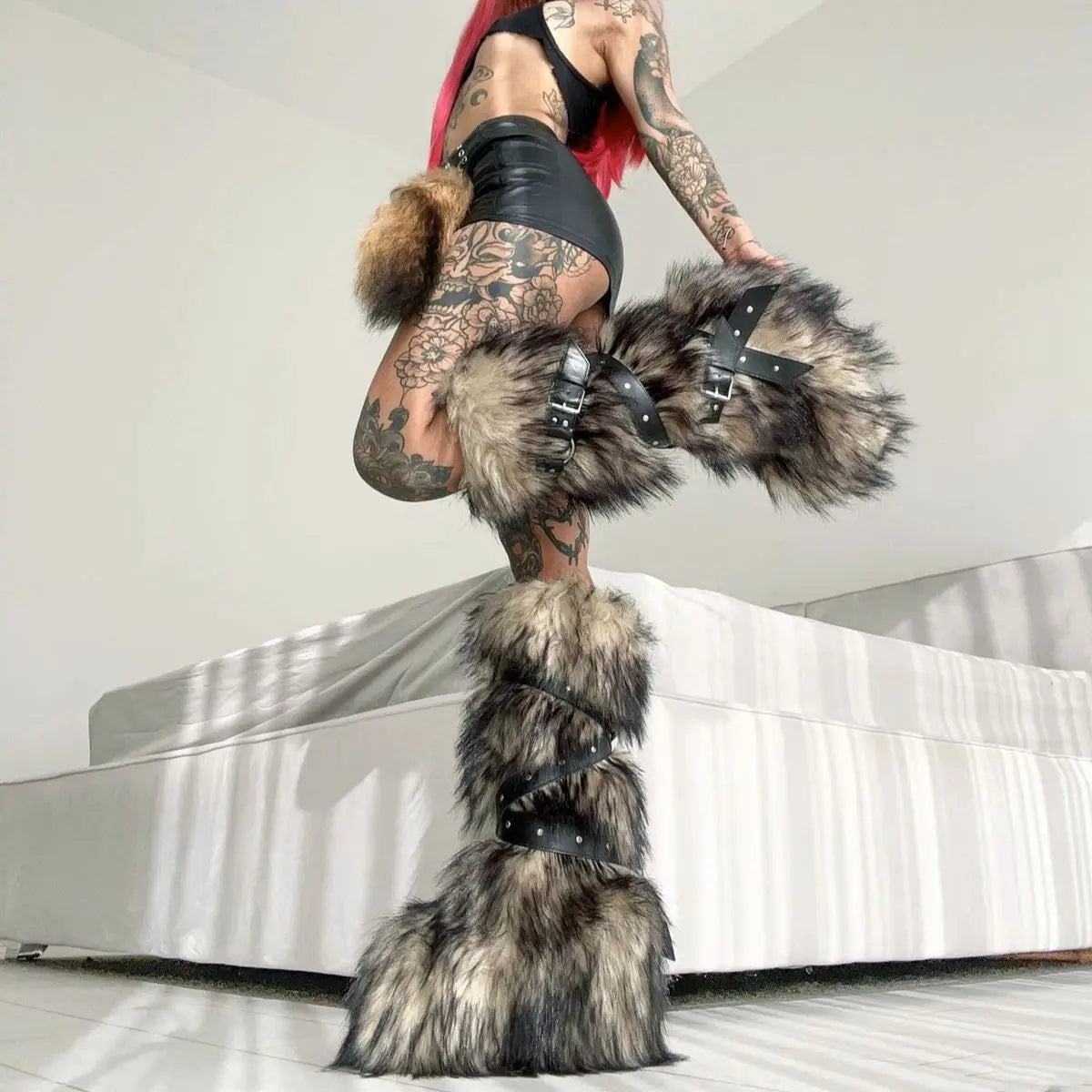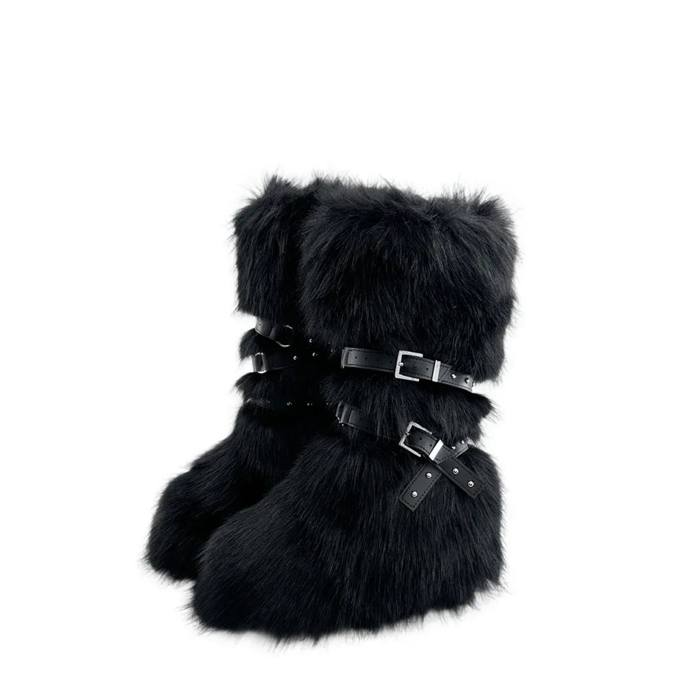 Dermearne Faux Fur Knee-High Boot Round Toe Height Increasing Wild Winter Warmer Belt Buckle Slip-On Fashion Luxury Sexy Women Shoe Newest